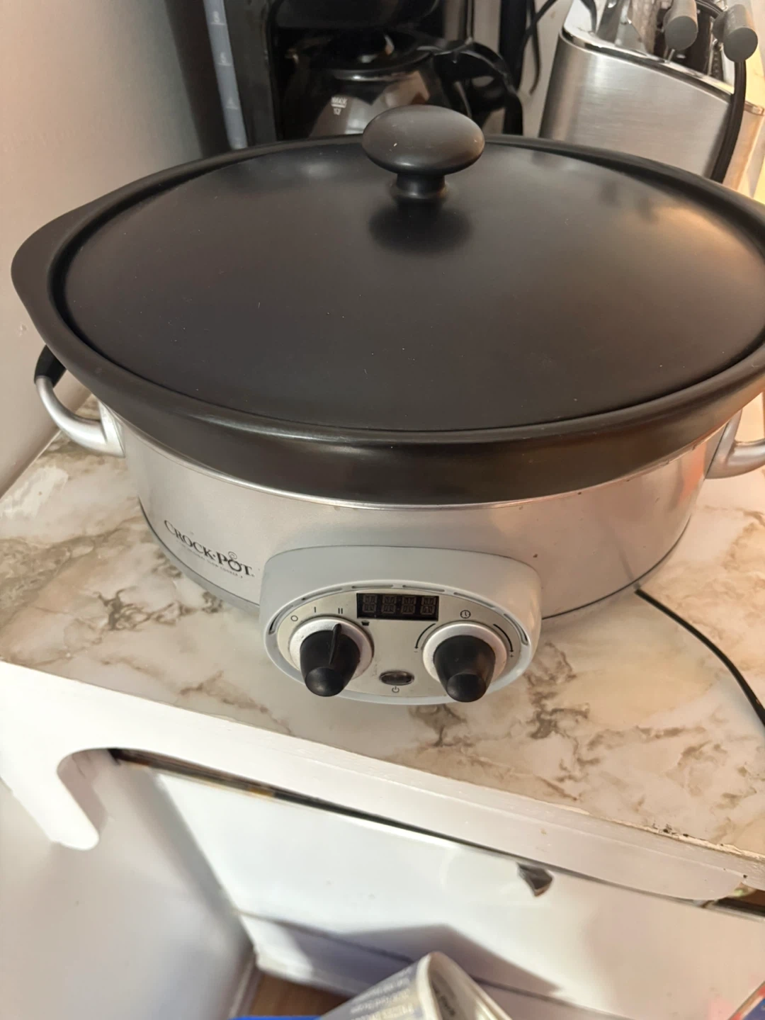 This Crock-Pot is the original slow cooker. It has two knob controls and a digital timer display. The pot is silver with a black lid. It's great for making large meals or batch cooking.