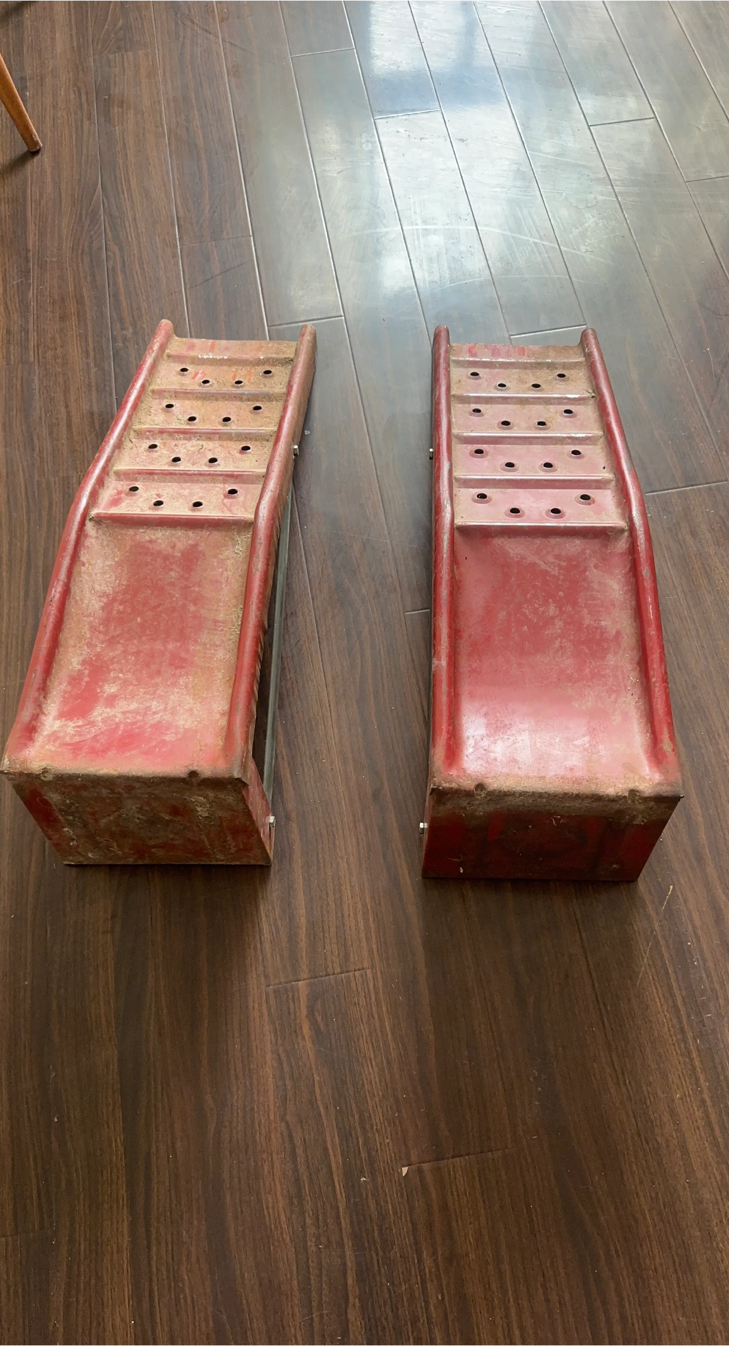 Selling a pair of red metal car ramps. These ramps have seen some use and show signs of rust and wear, adding to their character. These are suitable for solid-duty vehicles.