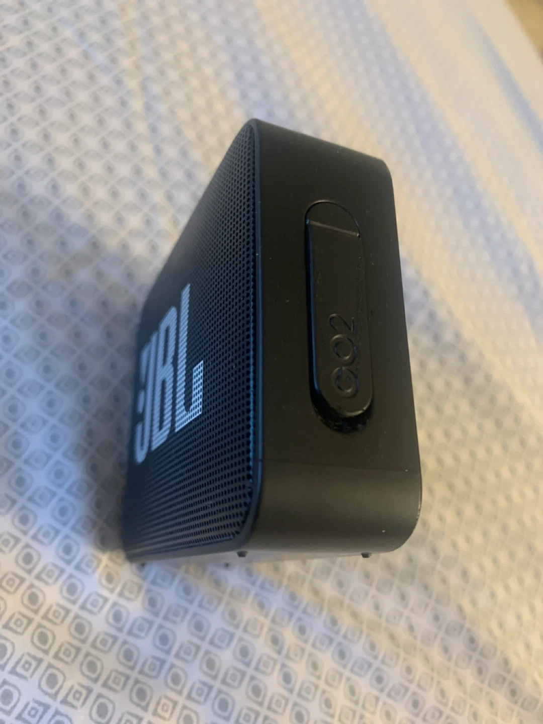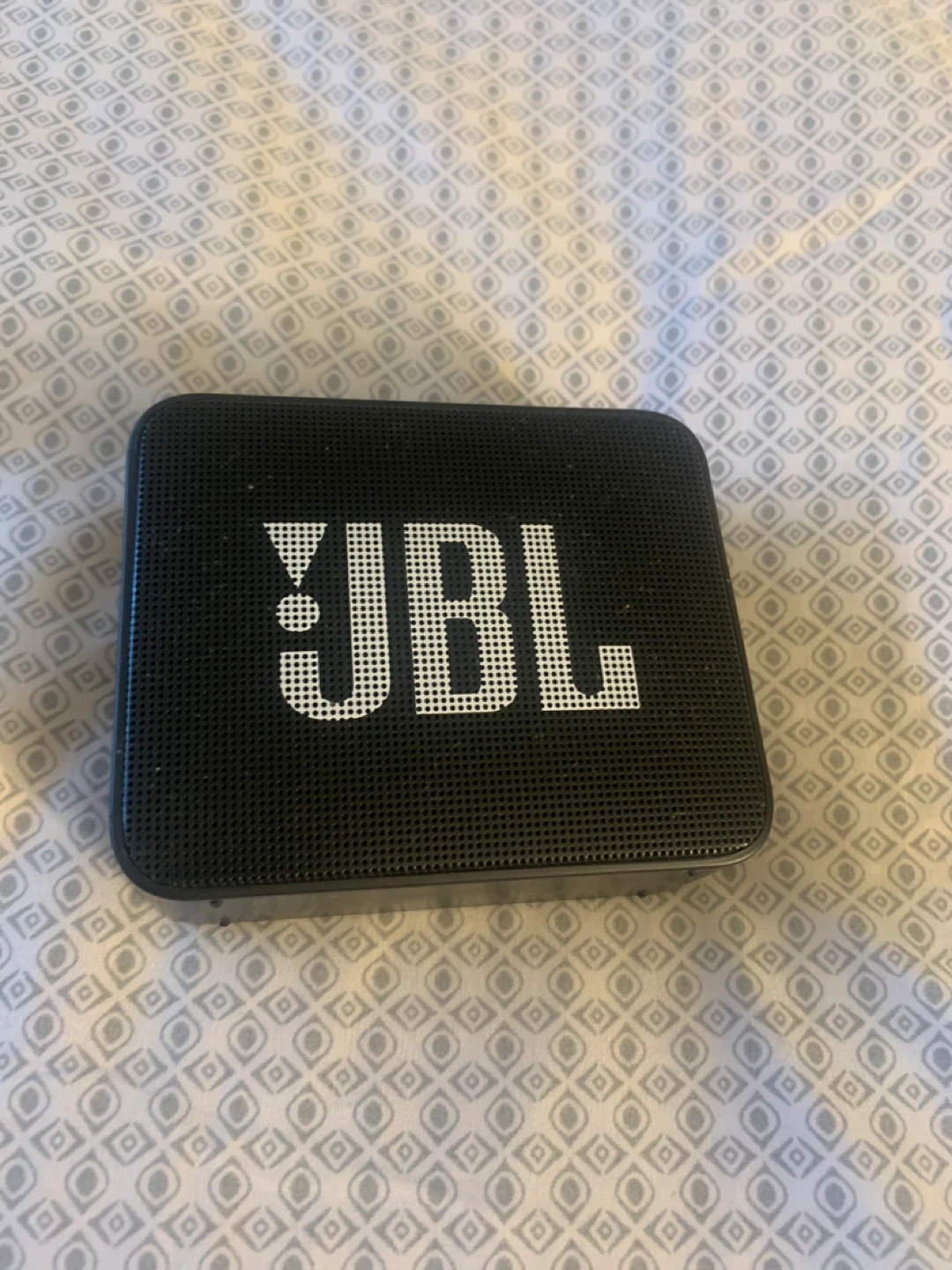 This is a black JBL GO2 portable Bluetooth speaker. It's a compact and durable speaker. Perfect for on-the-go listening!