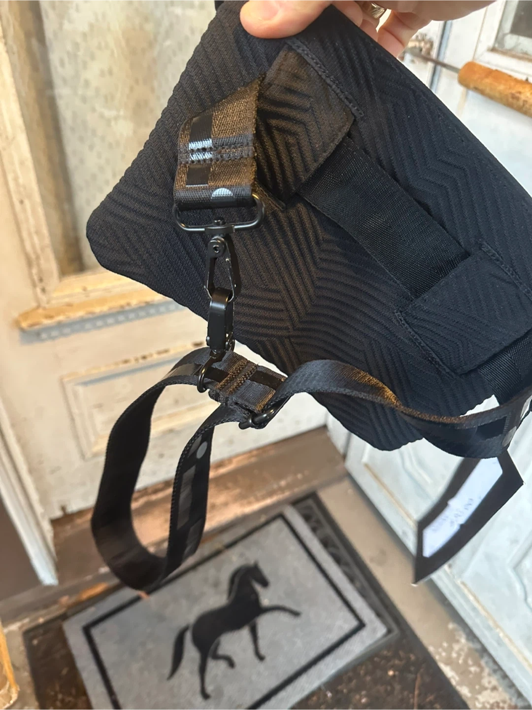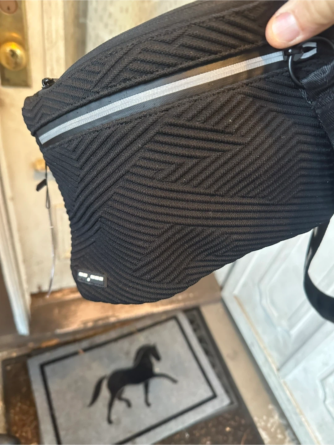 Black crossbody bag with a textured chevron pattern. It's made from a durable material and features an adjustable strap with a metal clasp. Includes a reflective stripe detail along the zipper.