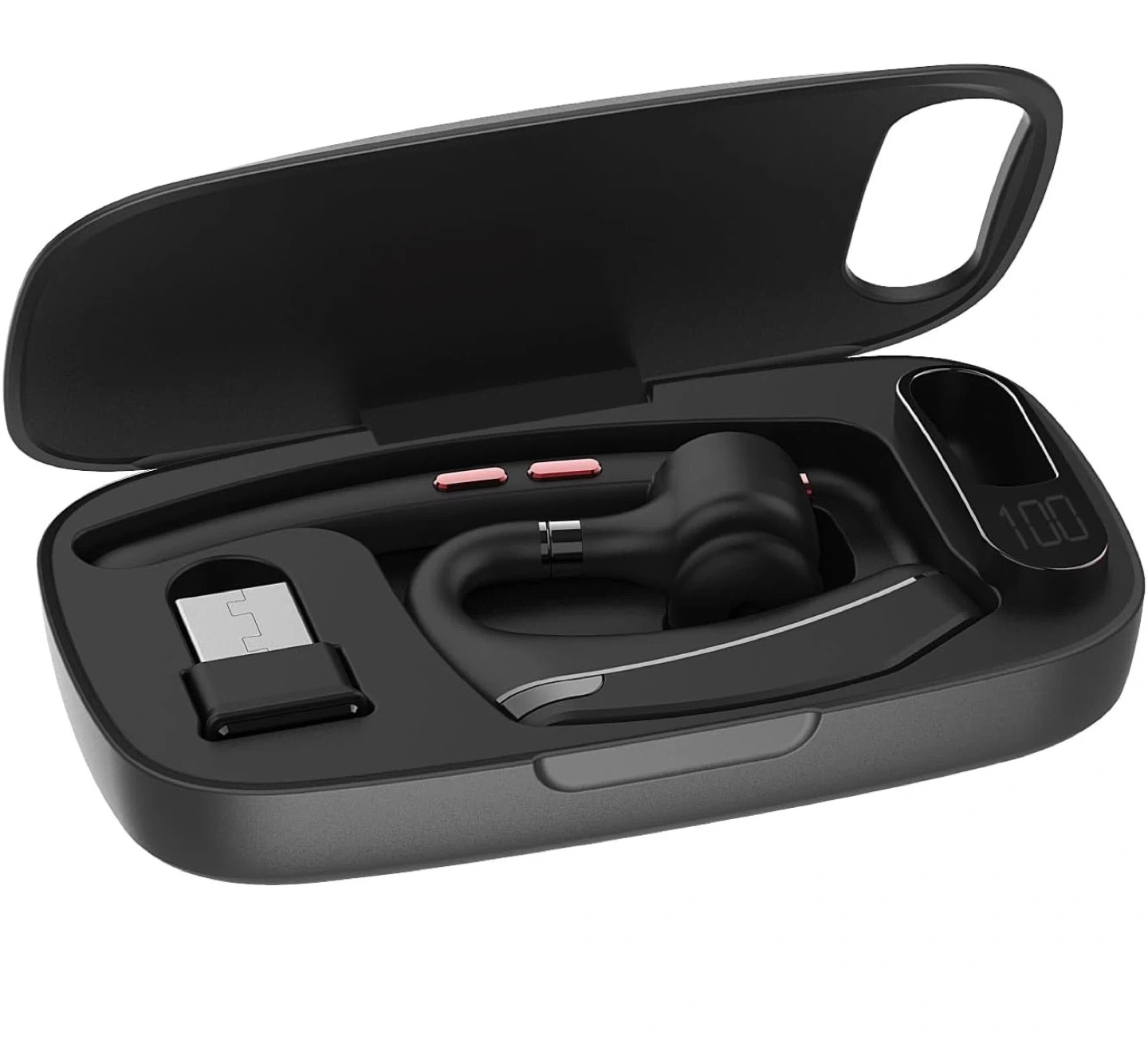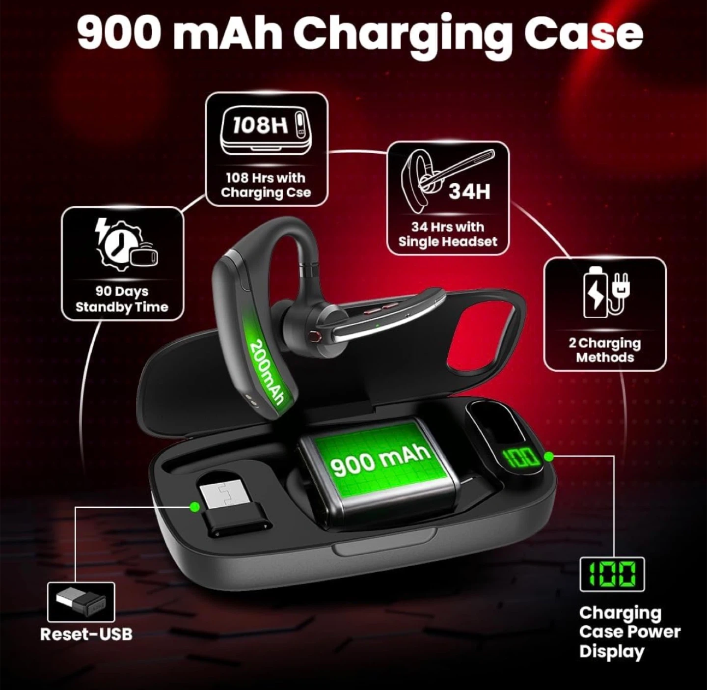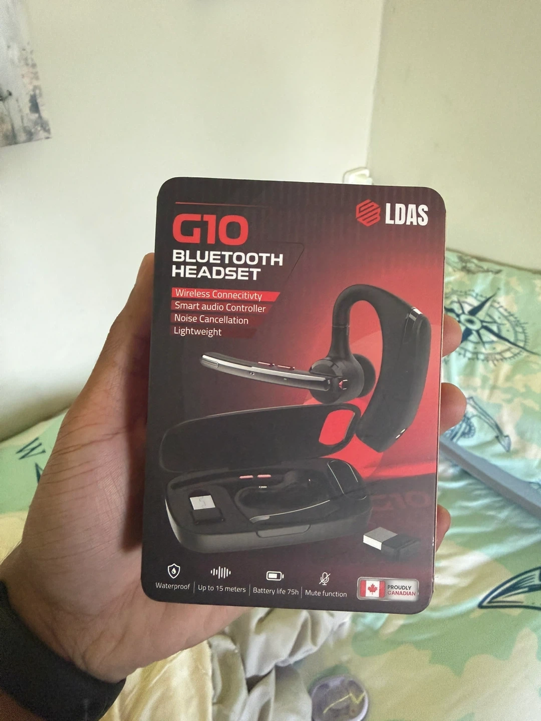 LDAS G10 Bluetooth headset with a 900mAh charging case. It offers 108 hours of talk time with the charging case and 34 hours with the single headset. Features dual-mic noise cancelling and waterproof up to 15 meters. Battery life is 75h. This headset is lightweight.