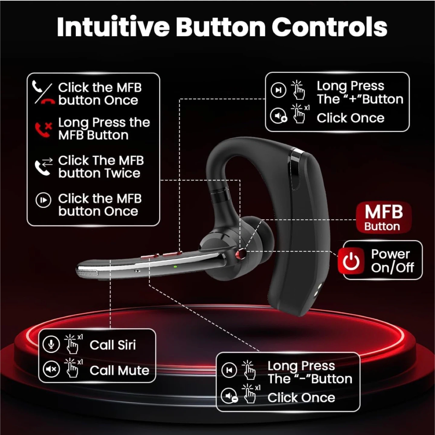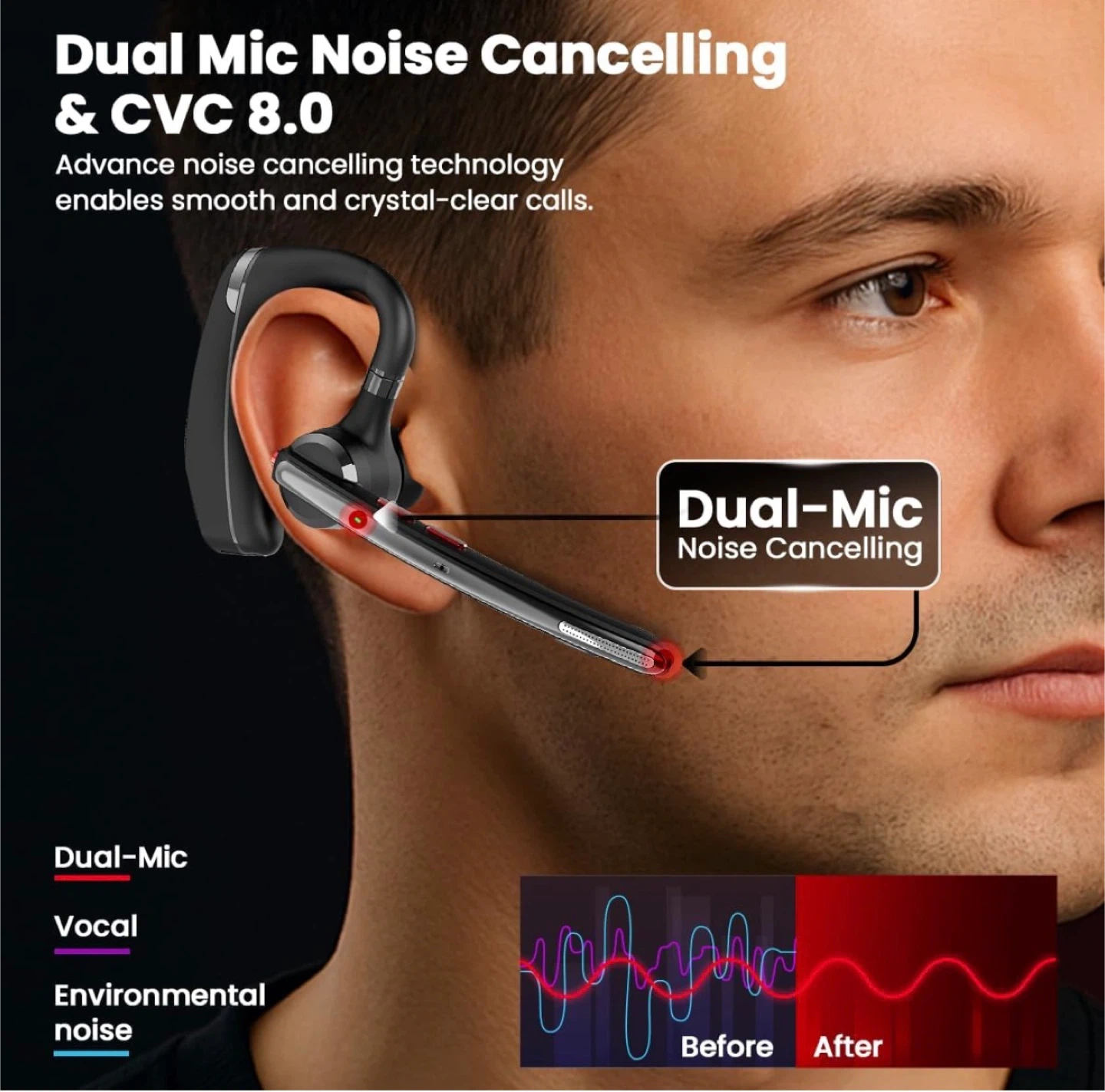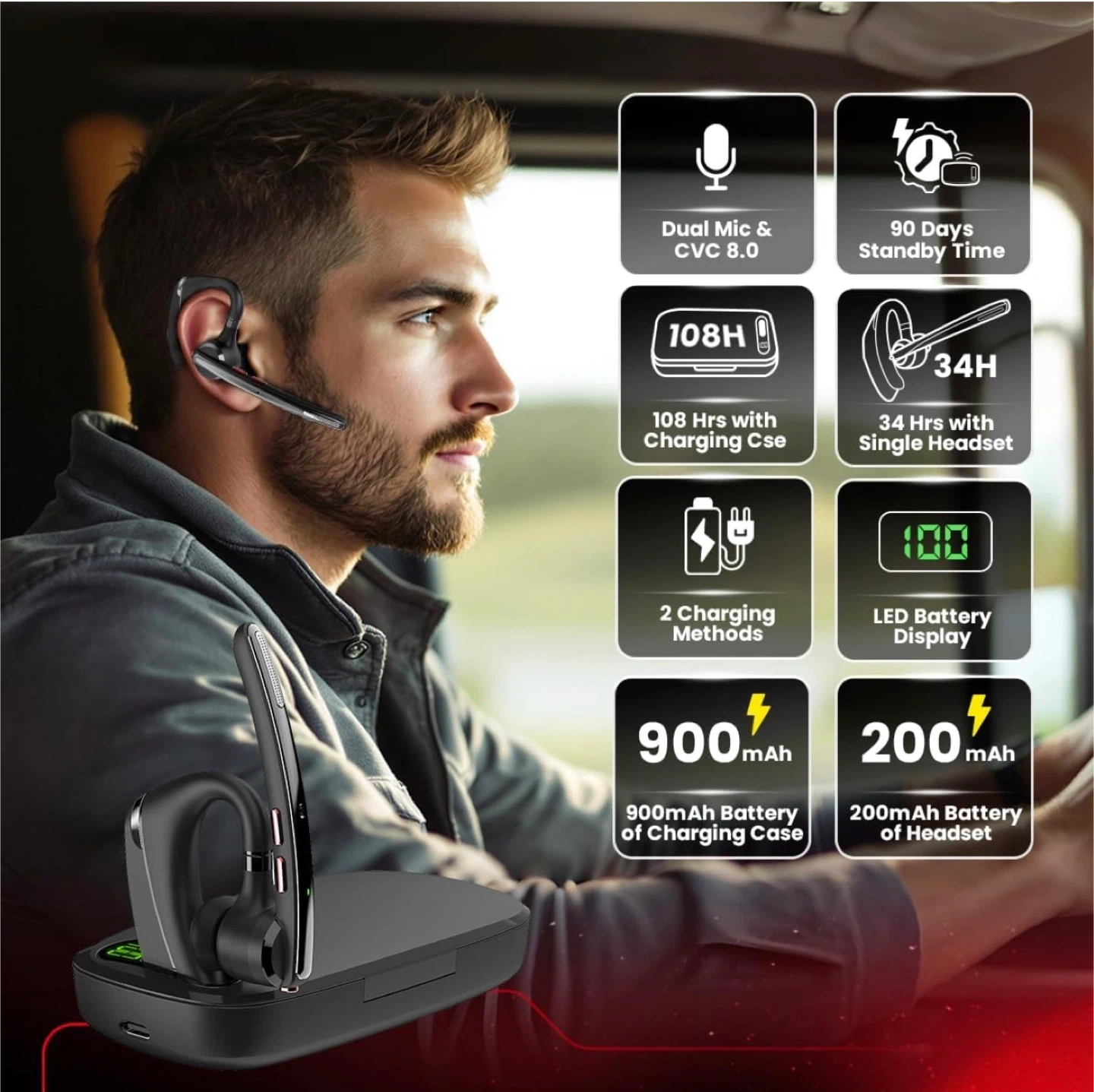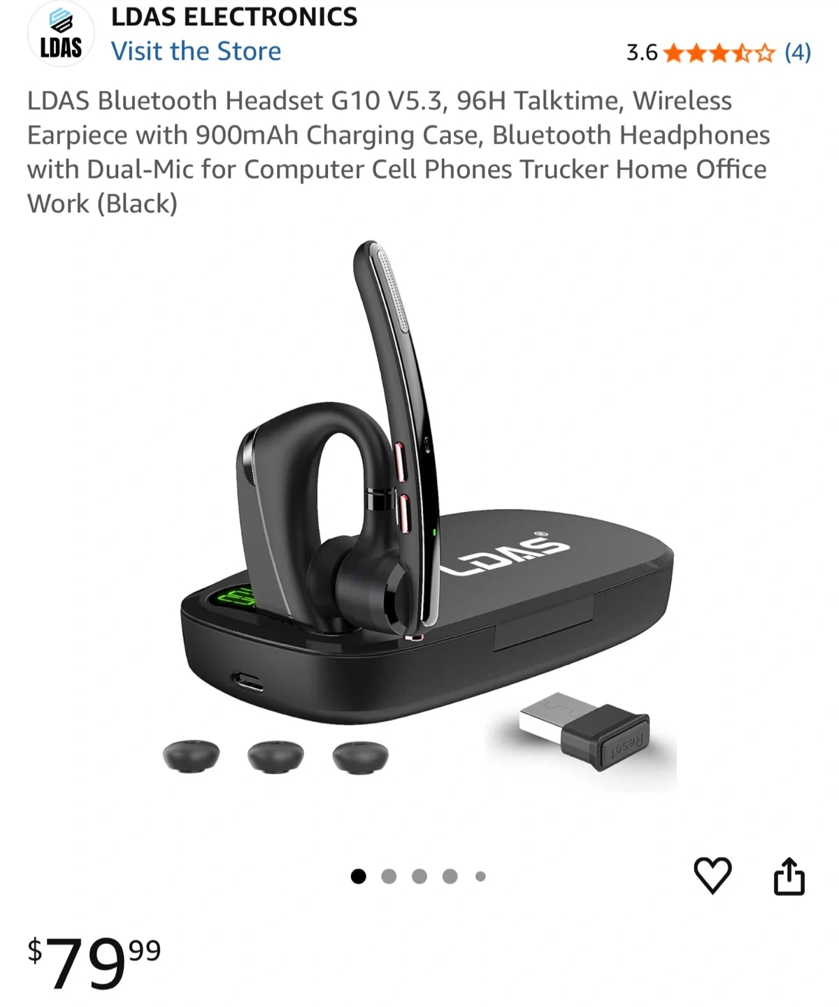 LDAS G10 Bluetooth headset with a 900mAh charging case. It offers 108 hours of talk time with the charging case and 34 hours with the single headset. Features dual-mic noise cancelling and waterproof up to 15 meters. Battery life is 75h. This headset is lightweight.