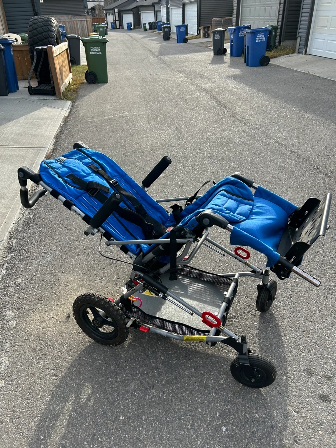 10Convaid Rodeo Tilt Lightweight wheelchair suitable for larger child/teen/smaller adult. Has tilt, adjustable handle, footrest, and armrests. Comes with headrest extension and extra support pieces for trunk or head. Has transport Canada approved tie downs and folds down completely when not in use. Comes with pneumatic tires for off pavement use-we used this chair to take our teenage son with us on family trail walks. Used less than five times. Dimensions available on request. Serious inquiries only please.