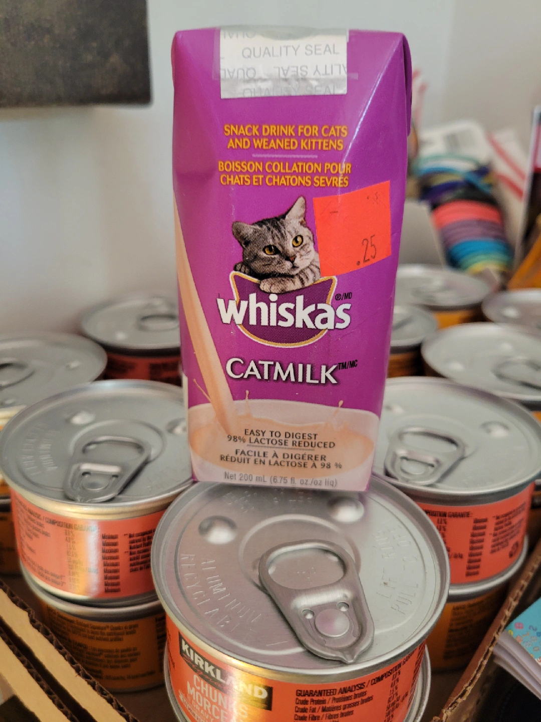 100Whiskas Catmilk is a snack drink for cats and weaned kittens. It's easy to digest with 98% lactose reduced. The package contains 200 mL (6.75 fl oz). some cans of catfood too