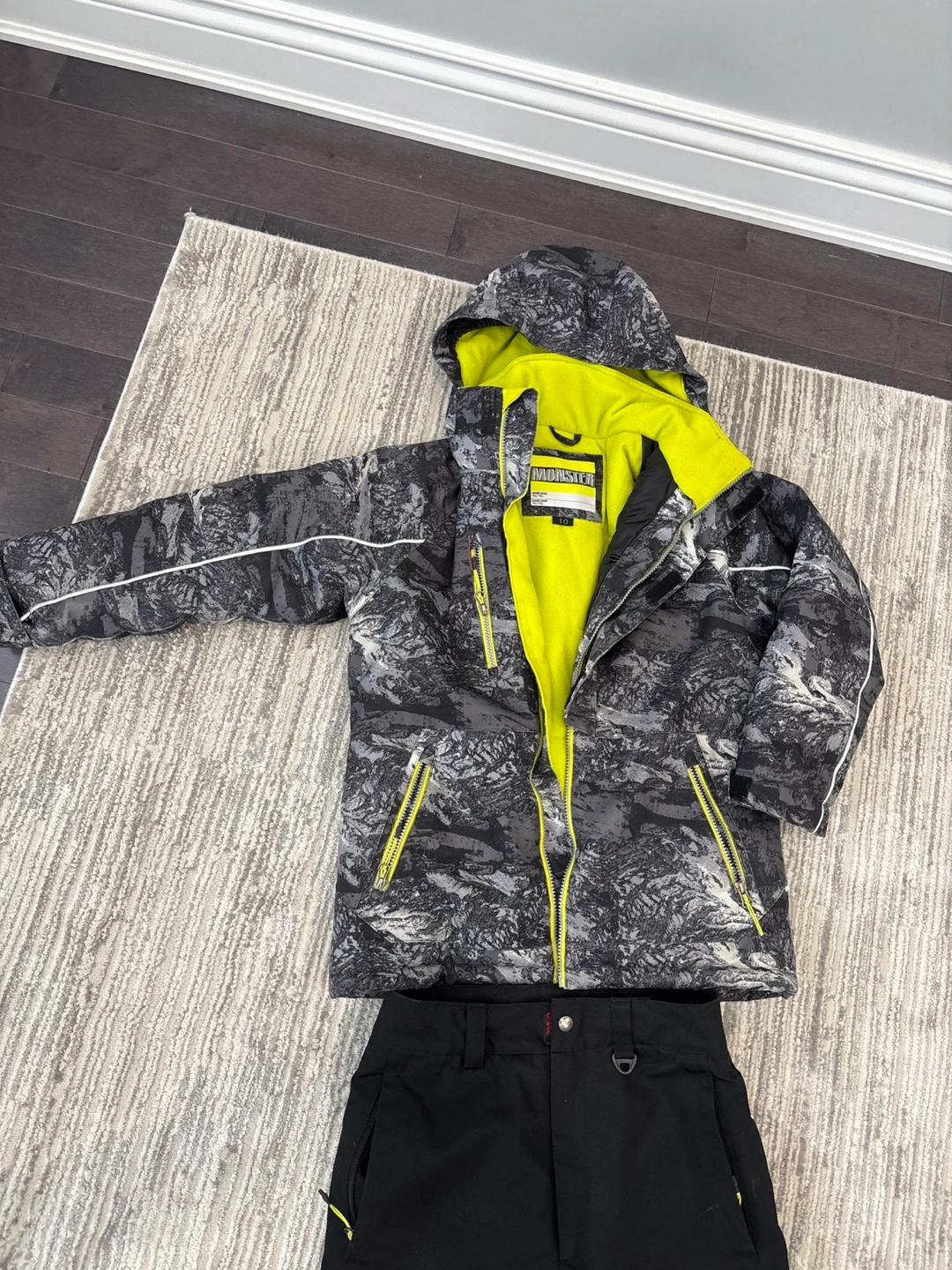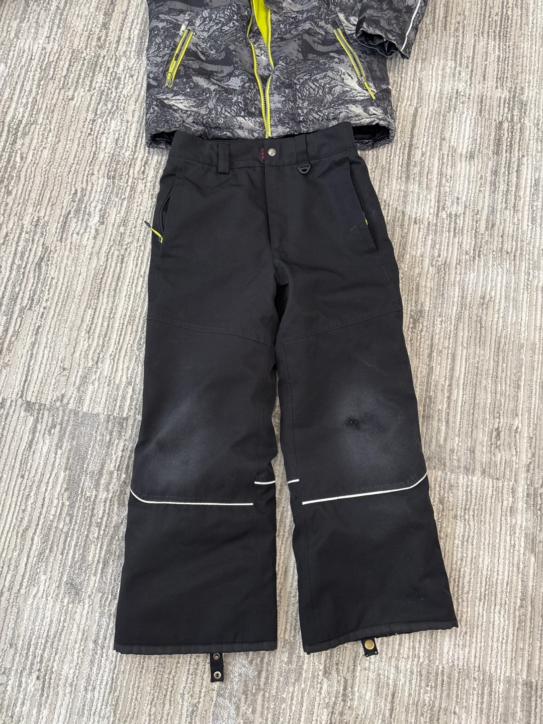 Selling a Whistler brand ski jacket and pants set for kids. The jacket features a cool grey and black pattern with a bright yellow lining. The pants are black. Perfect for hitting the slopes this winter!