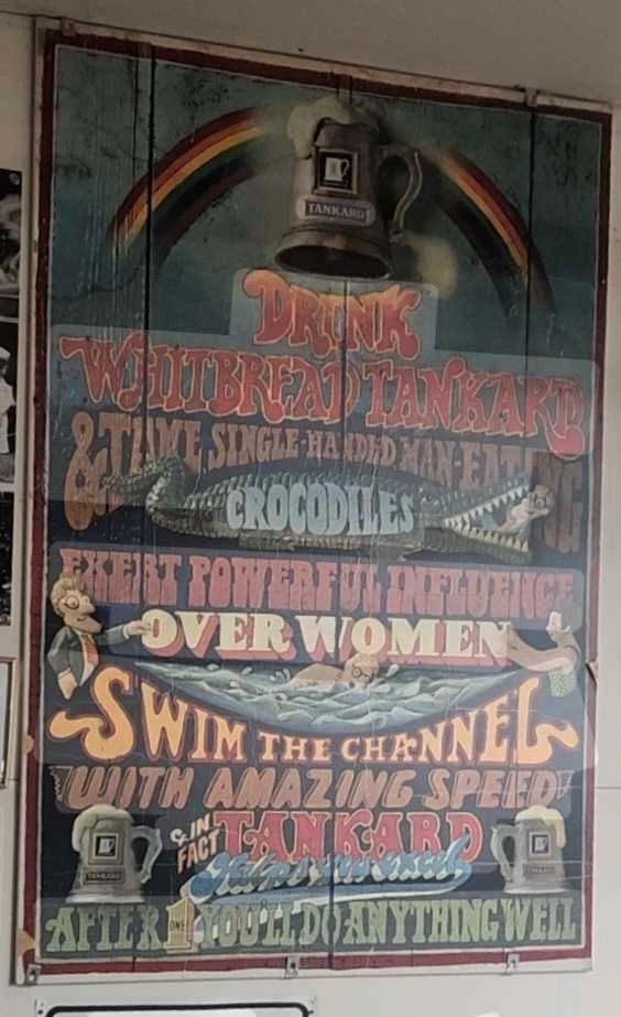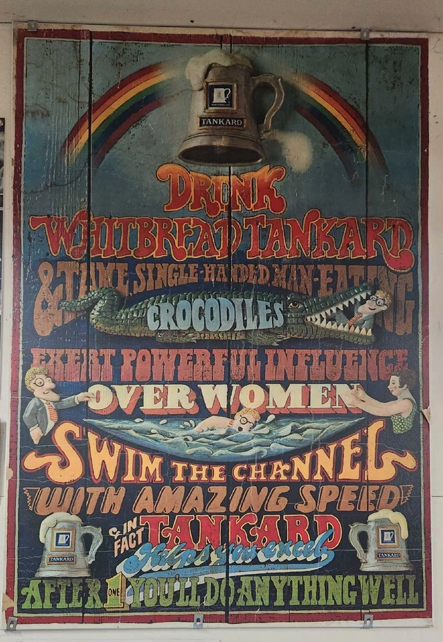 Step right up and behold this pre-loved Whitbread Tankard sign, a riot of vintage charm that's seen a bit of life but is still bursting with character. This sign features a quirky, colourful design with an advertisement for Whitbread Tankard, showcasing a whimsical scene of crocodiles, channel swimming, and promises of influence over women. While it shows signs of its age – think of it as seasoned rather than worn – it adds to the authentic vintage vibe, ready to inject some old-school fun into your space. This sign is not just a piece of decor; it's a conversation starter, a slice of history, and a testament to times when advertising was as much art as it was promotion. Condition: Used - Fair More Info: Vintage, Antiques For Sale By: Owner
