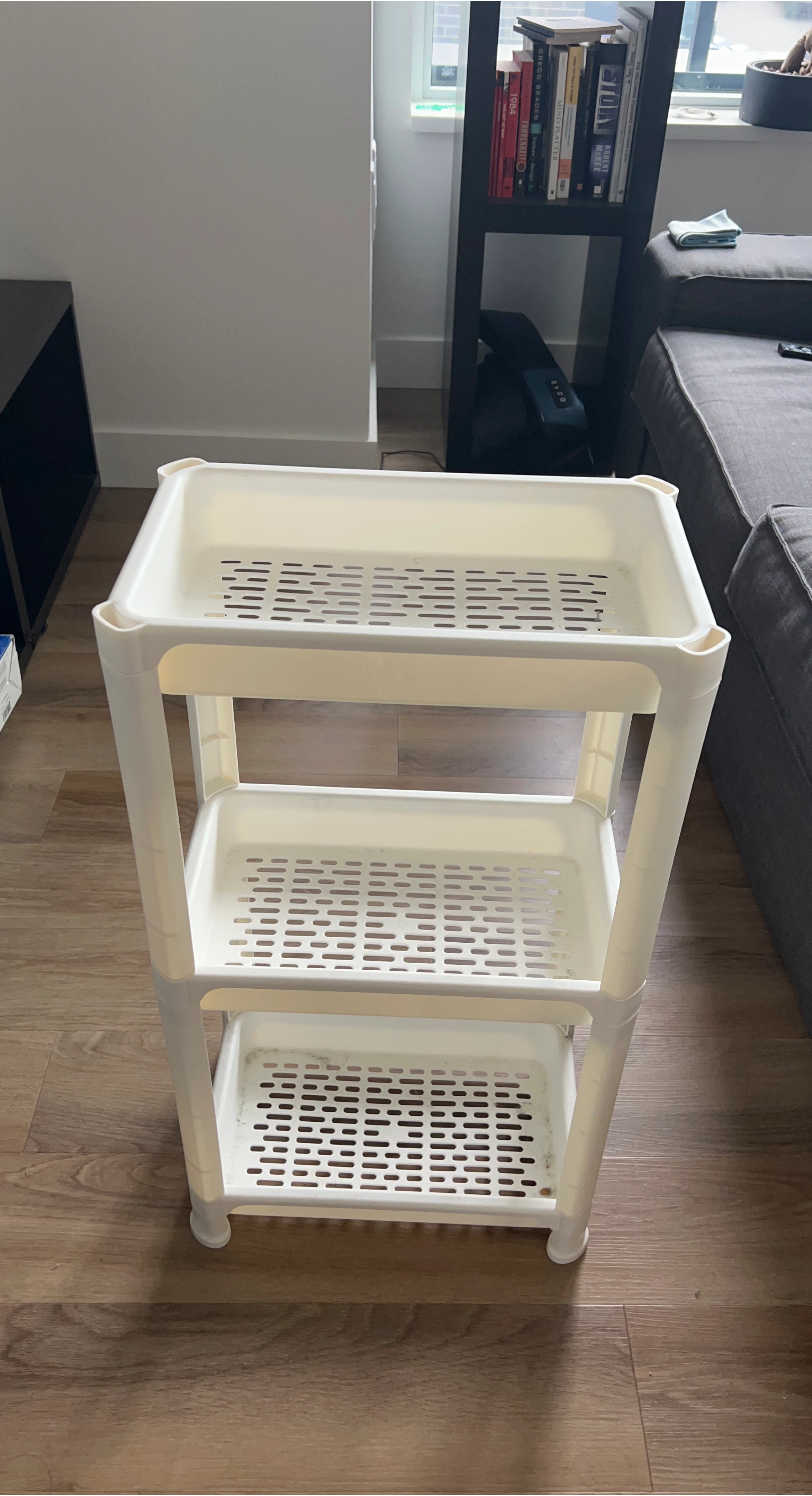 Selling a handy 3-tier storage shelf! It's made of white plastic and is great for organizing items in your home. It has some signs of use, as you can see in the photos, but it's still perfectly functional for storage
