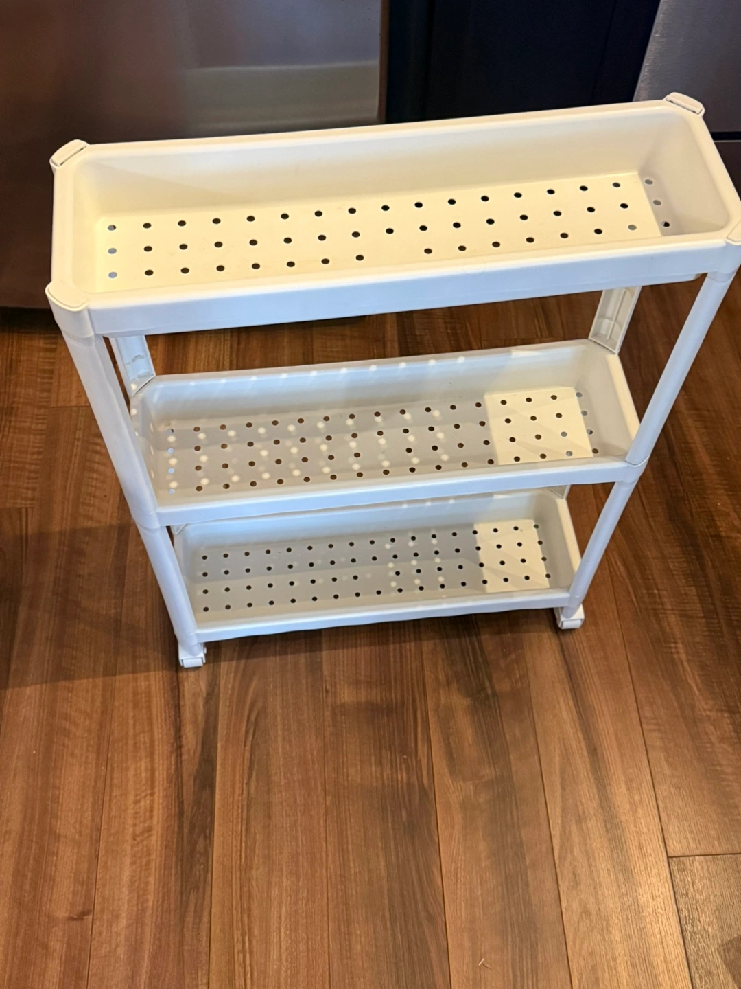 82Three-tiered shelving unit. Has a white color and an open design. The three shelves have an open, perforated design for drainage. Great for organizing small items and bringing a sense of calm to any space.