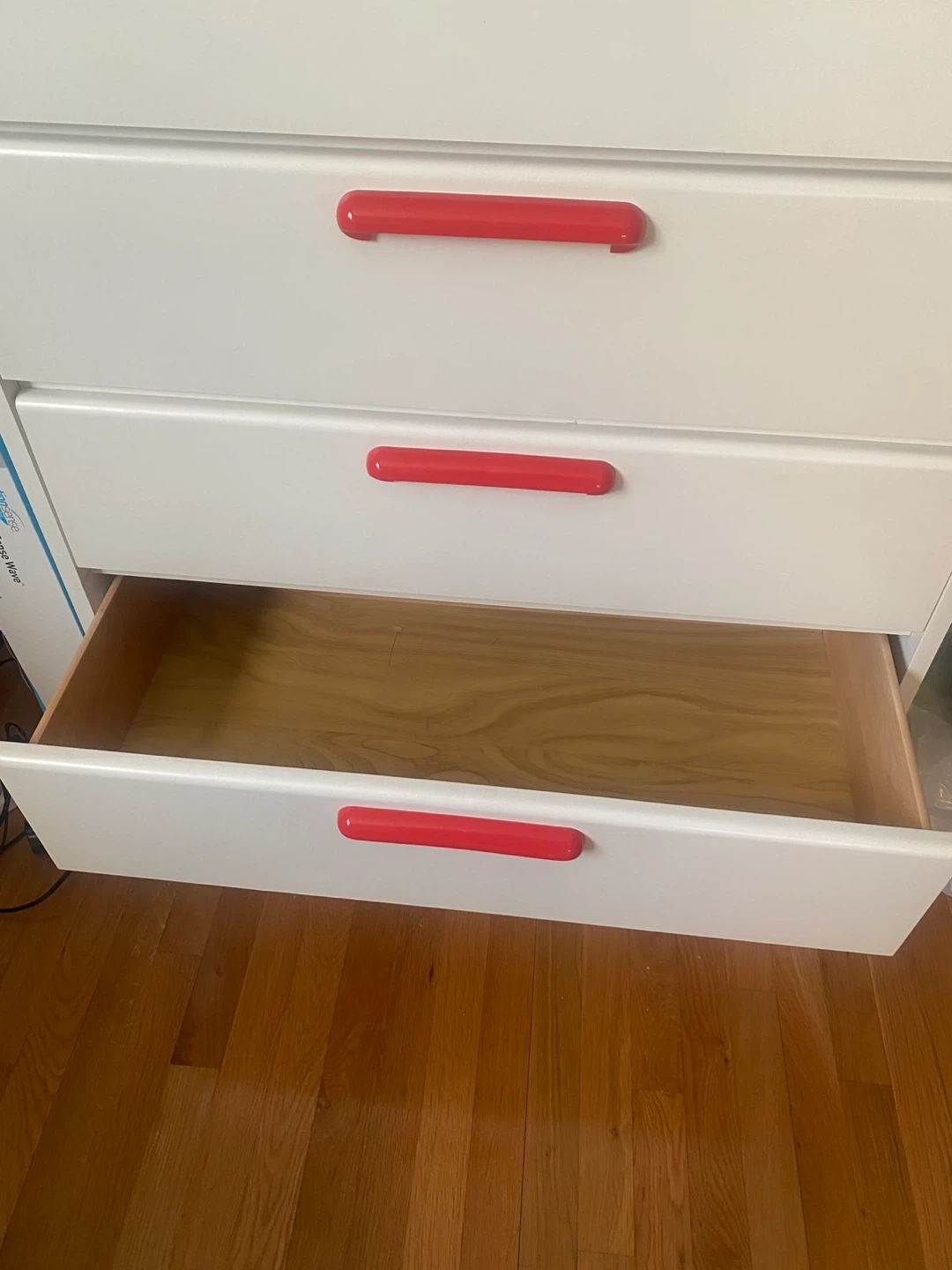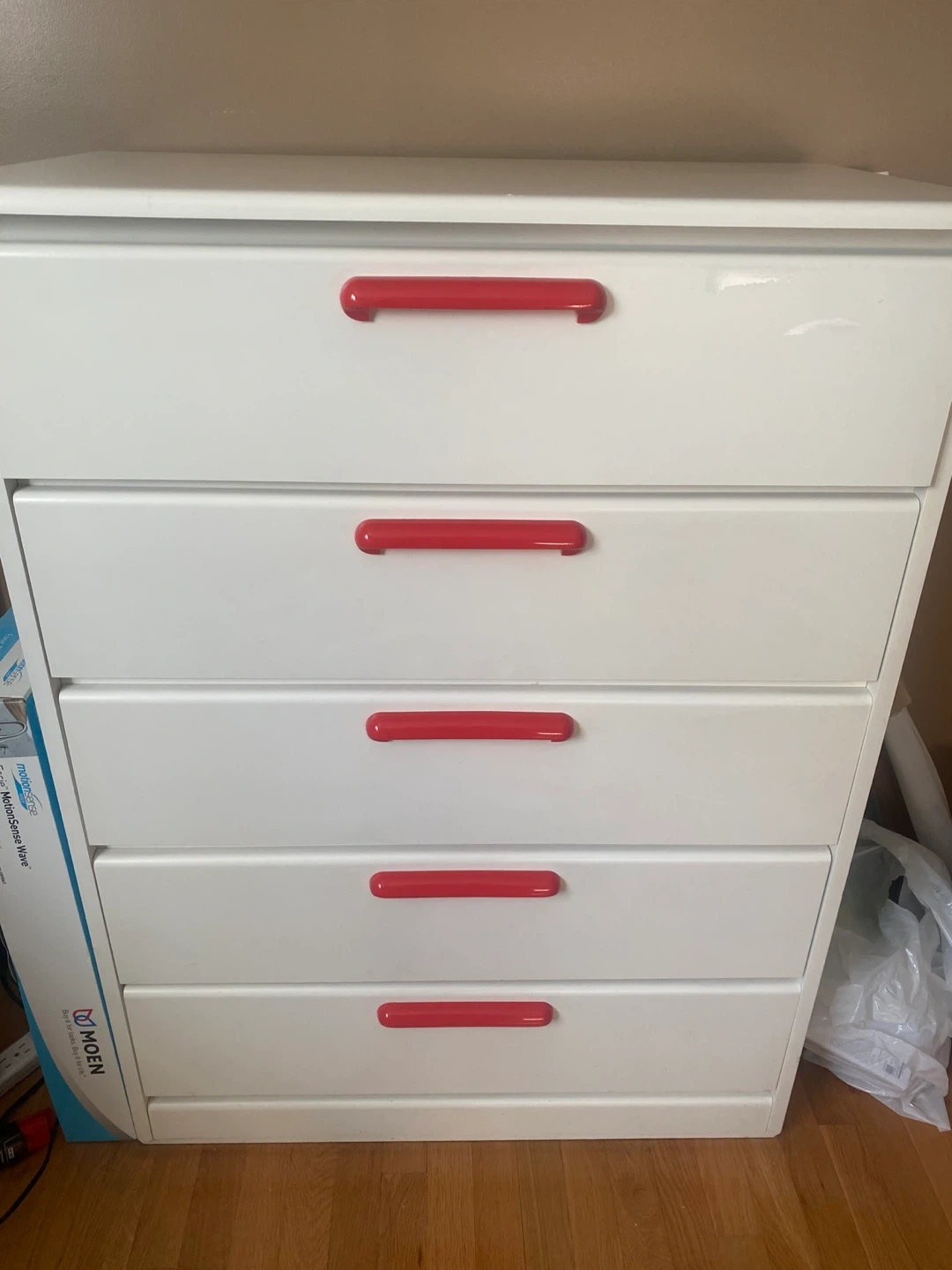 Here’s a white dresser with five drawers. It has cute red handles that add a pop of colour. It’s in good condition and ready for a new home!