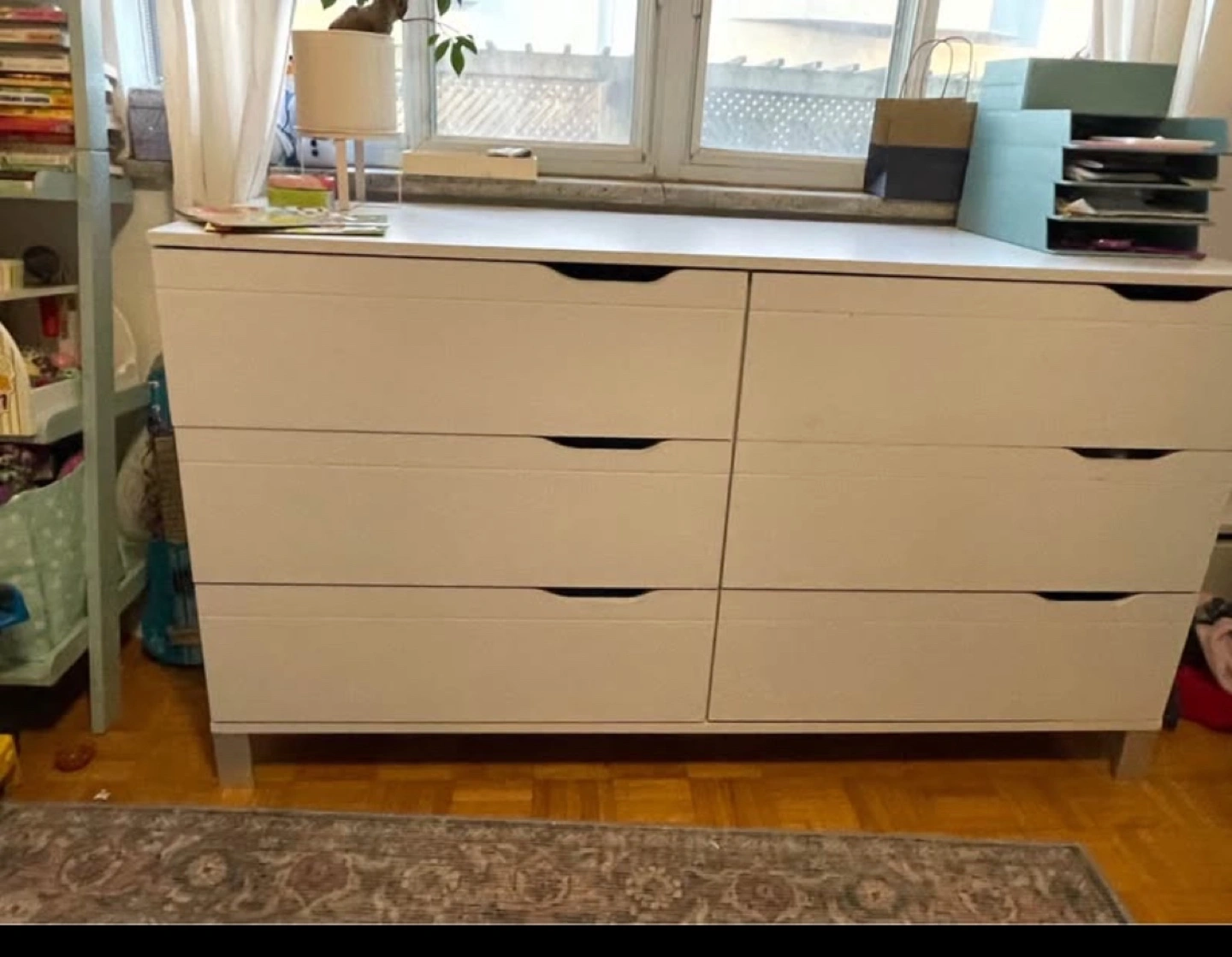 5White dresser, six drawers. Some minor surface scratches. Good used condition. Long dresser, ideal for bedroom or nursery. Minor damage to the pain that can likely be fixed with a furniture crayon.