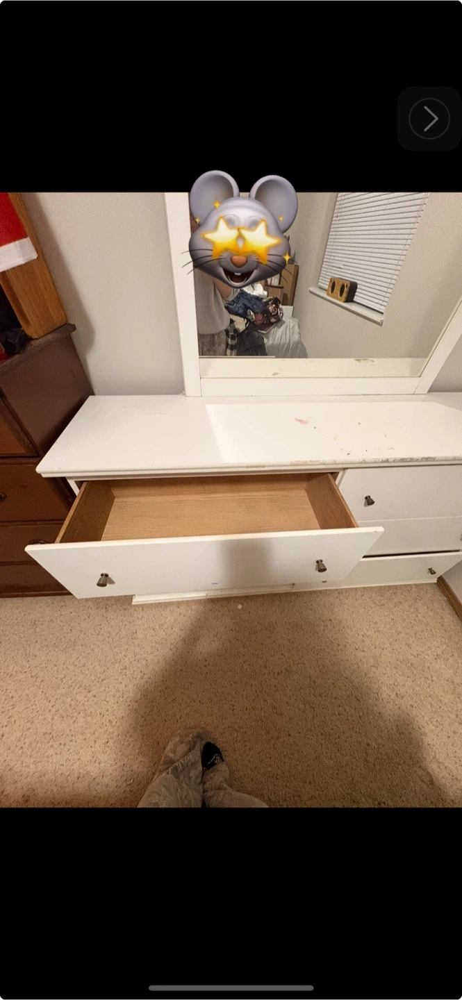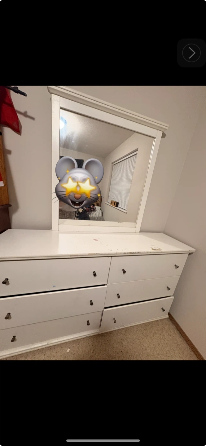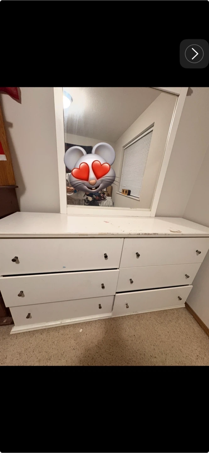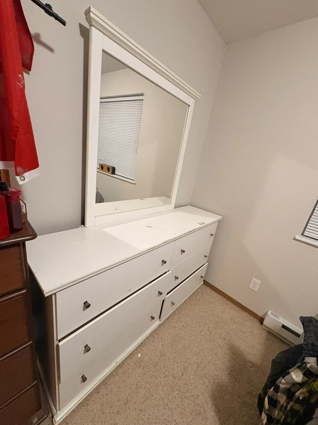 10This dresser is solid and fully functional with 6 spacious drawers and a large attached mirror. Perfect for a bedroom or guest room if you need plenty of storage! It does show some cosmetic wear a few paint marks, small chips, and general surface scuffs (see photos) but all drawers slide smoothly and it’s structurally sound. Features: • 6 roomy drawers (deep storage) • Large attached mirror • Neutral white finish easy to repaint or refresh • Sturdy and heavy (not particle board) Dimensions (approx): Width: 60” Height: 70” (with mirror) Depth: 18” Would make a great upcycle/refinishing project or perfect as-is for a spare room. Located in Sage Creek Smoke-free home and pet free home
