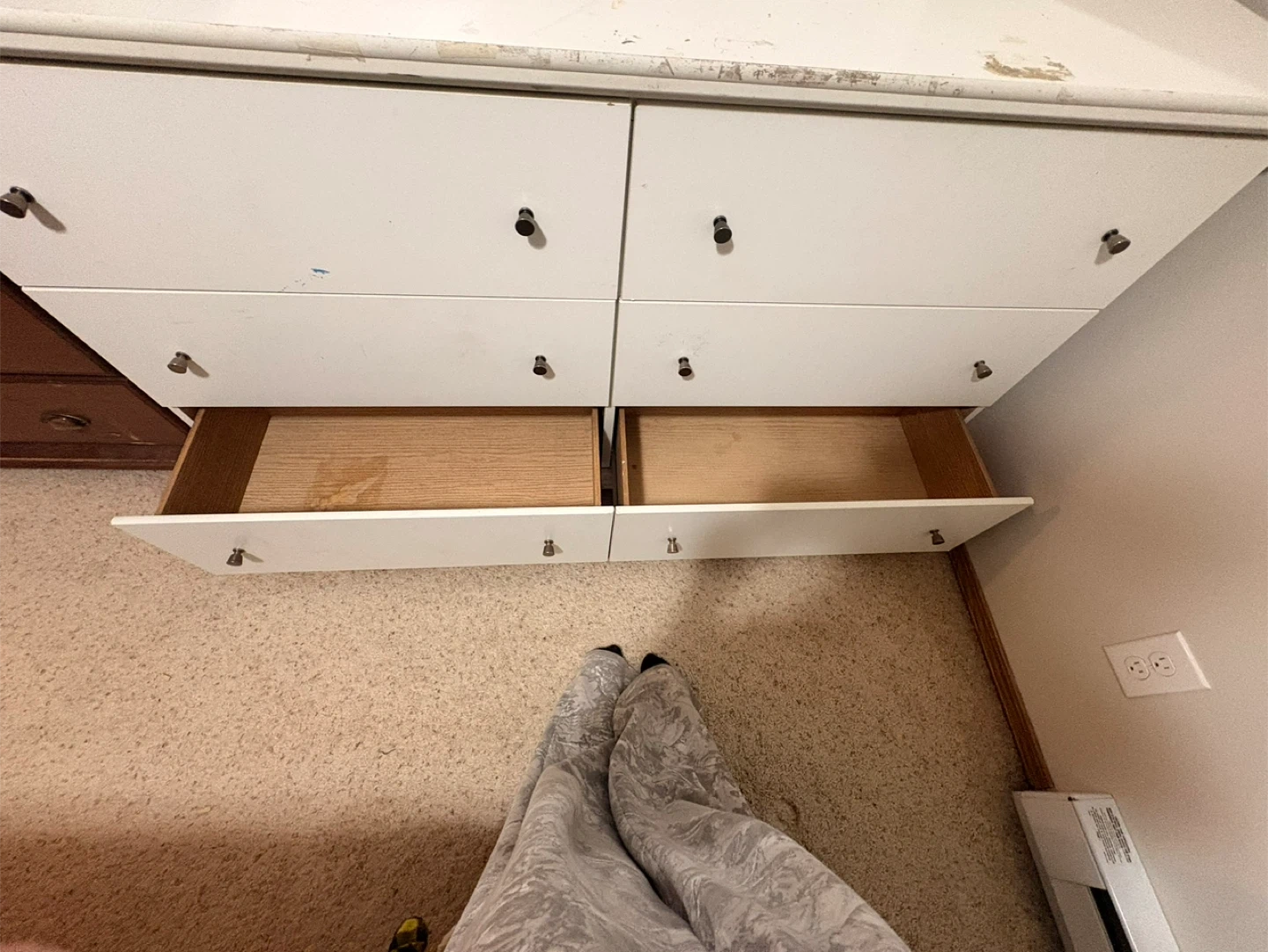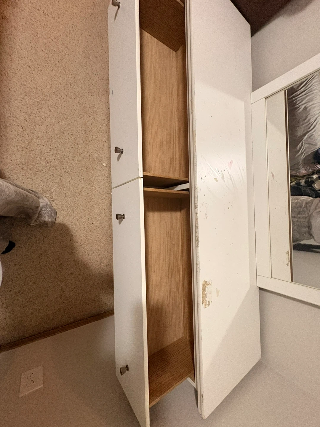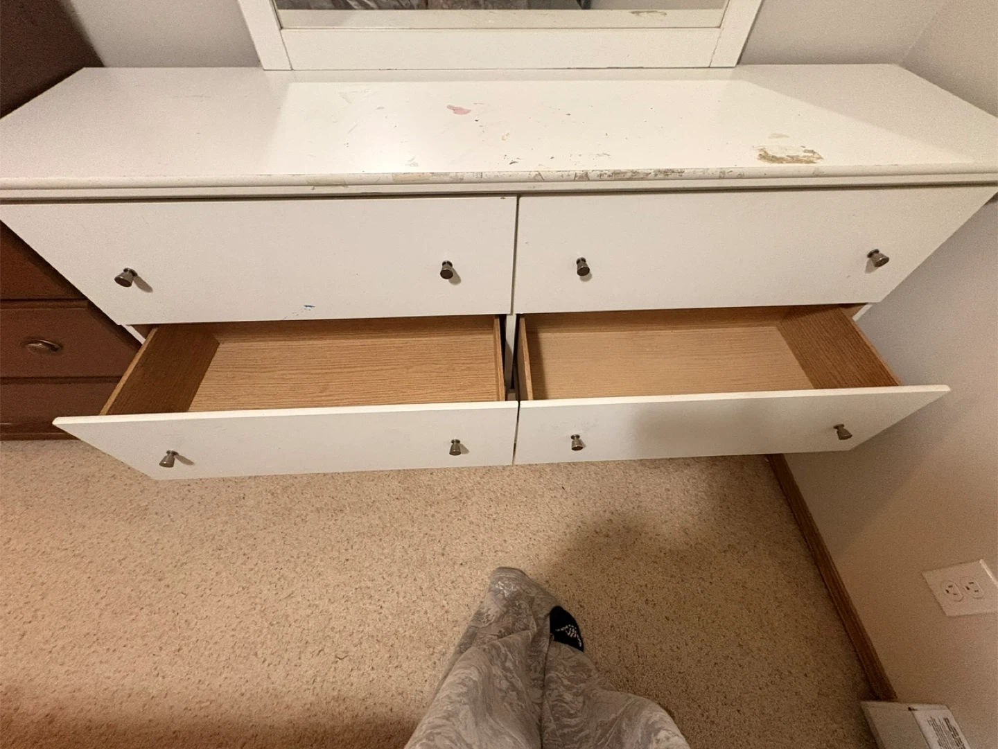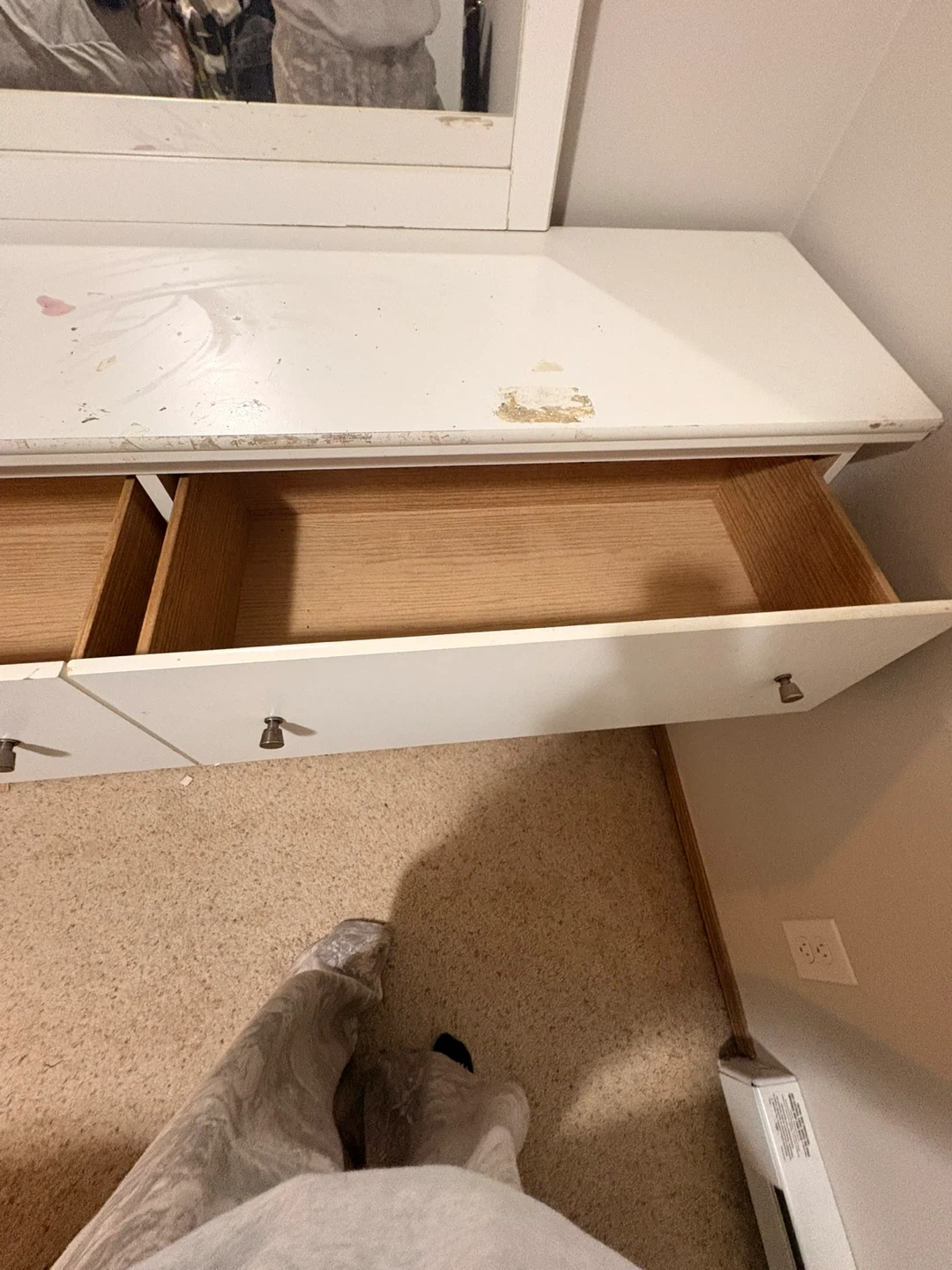 10This dresser is solid and fully functional with 6 spacious drawers and a large attached mirror. Perfect for a bedroom or guest room if you need plenty of storage! It does show some cosmetic wear a few paint marks, small chips, and general surface scuffs (see photos) but all drawers slide smoothly and it’s structurally sound. Features: • 6 roomy drawers (deep storage) • Large attached mirror • Neutral white finish easy to repaint or refresh • Sturdy and heavy (not particle board) Dimensions (approx): Width: 60” Height: 70” (with mirror) Depth: 18” Would make a great upcycle/refinishing project or perfect as-is for a spare room. Located in Sage Creek Smoke-free home and pet free home