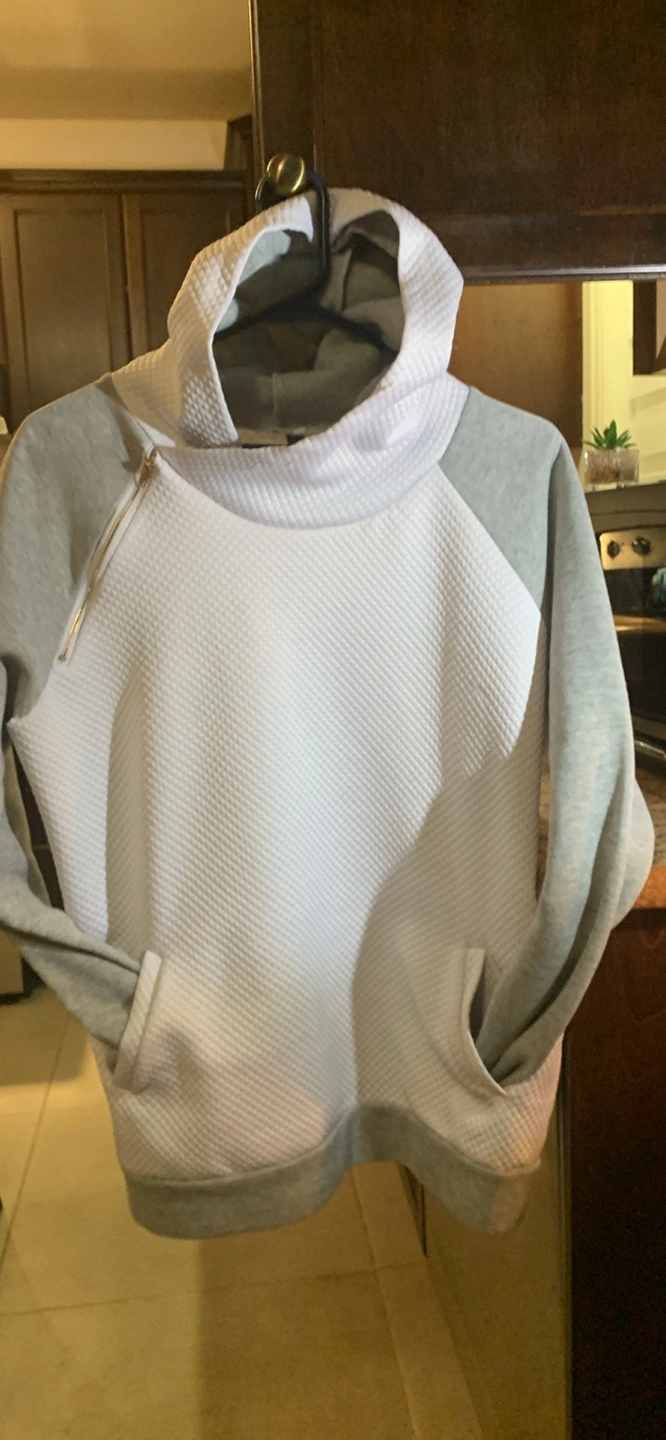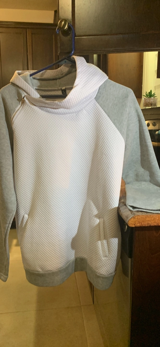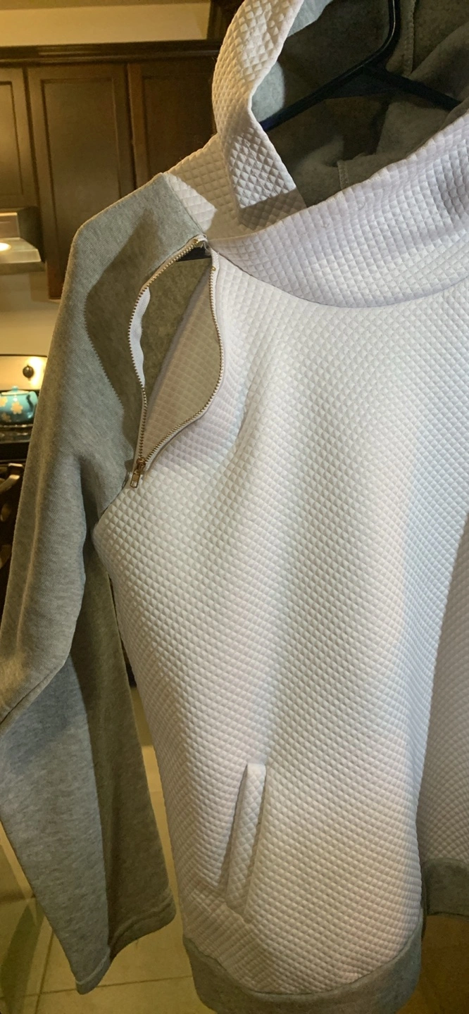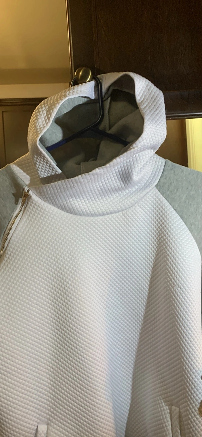 10White and grey hoodie with a zipper on the side. Has a hood. It has a quilted pattern. Comes from a pet and smoke free home.