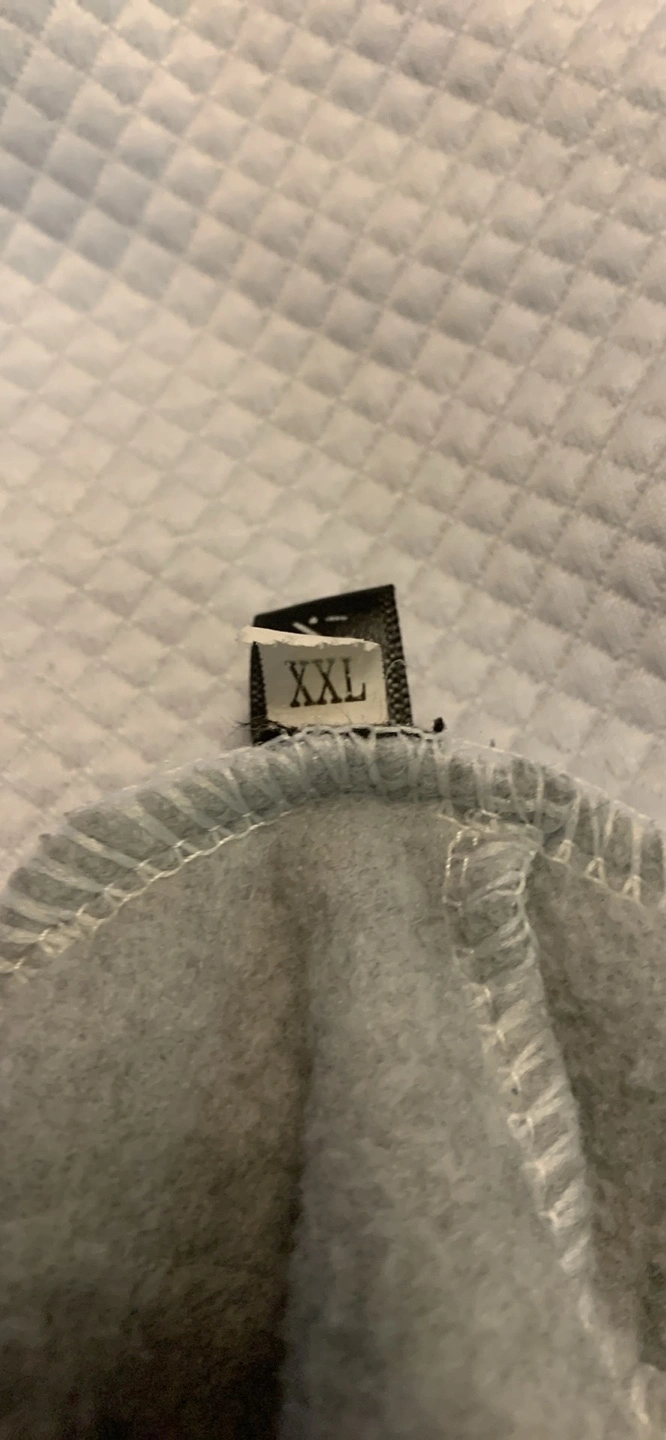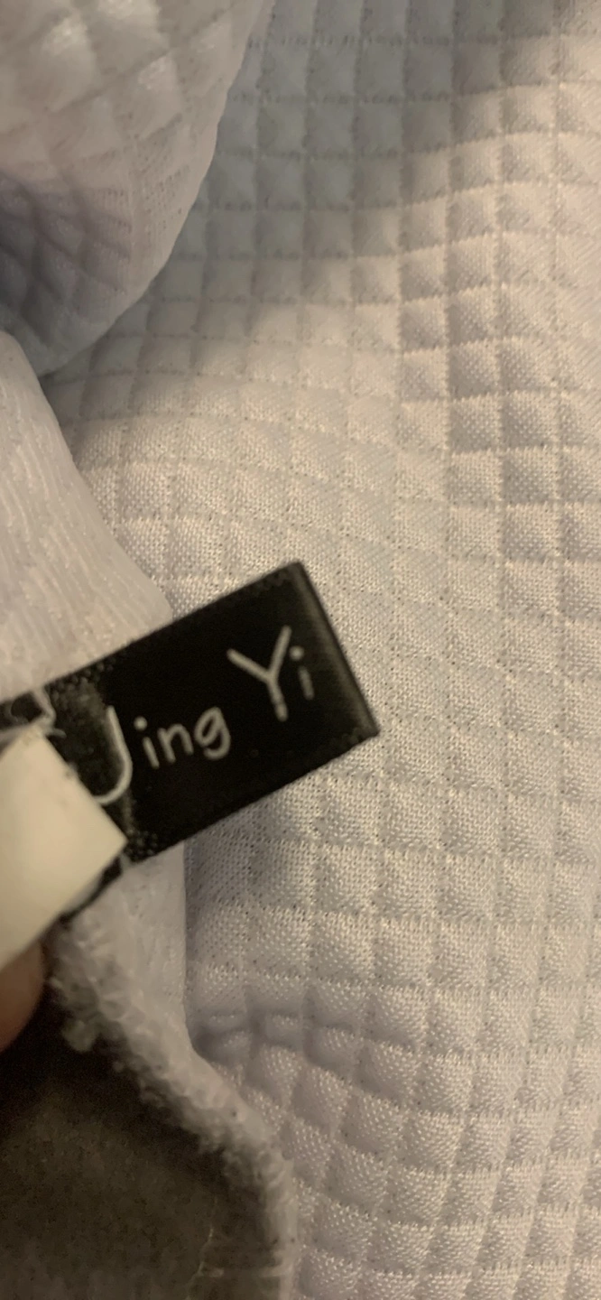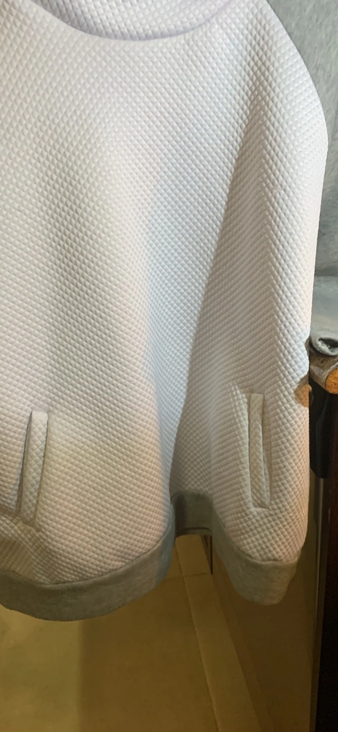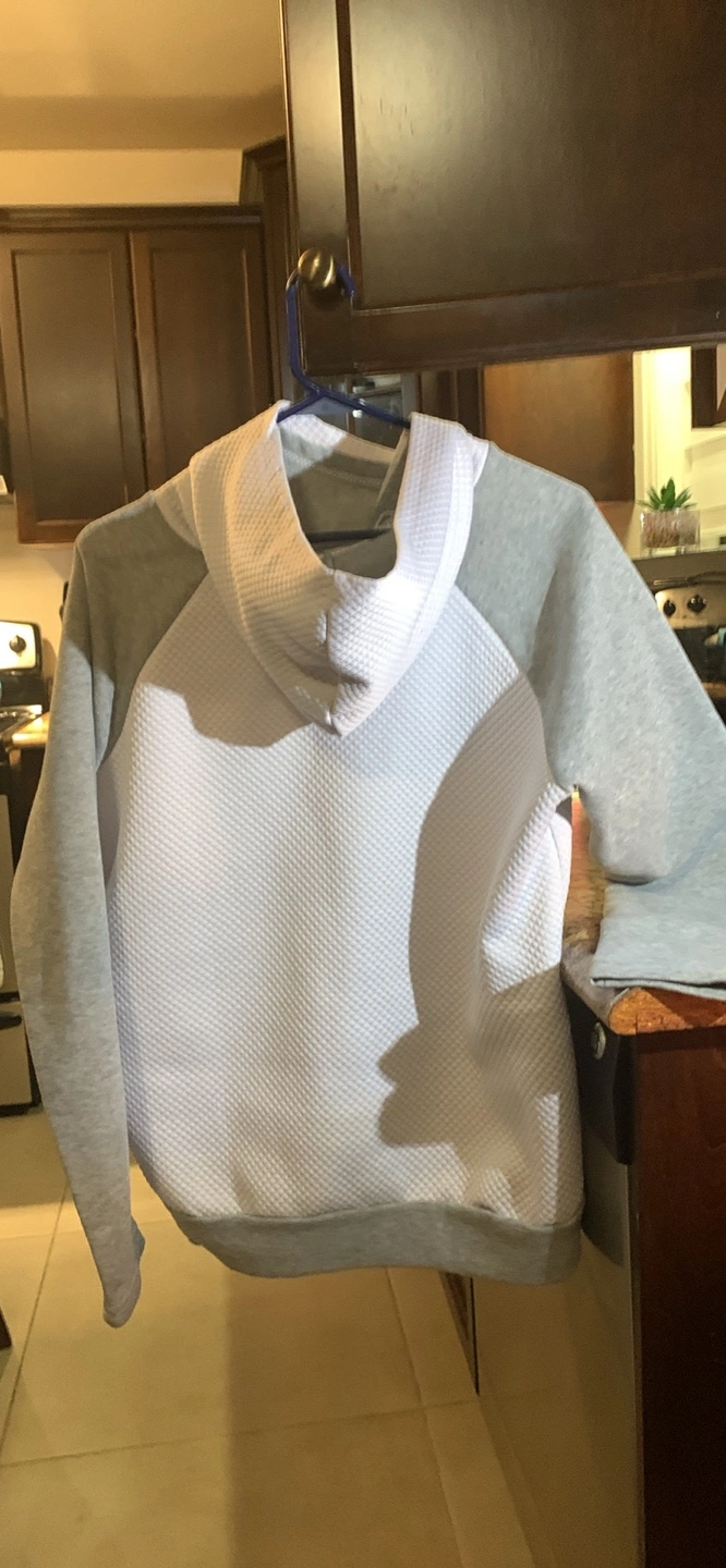 10White and grey hoodie with a zipper on the side. Has a hood. It has a quilted pattern. Comes from a pet and smoke free home.