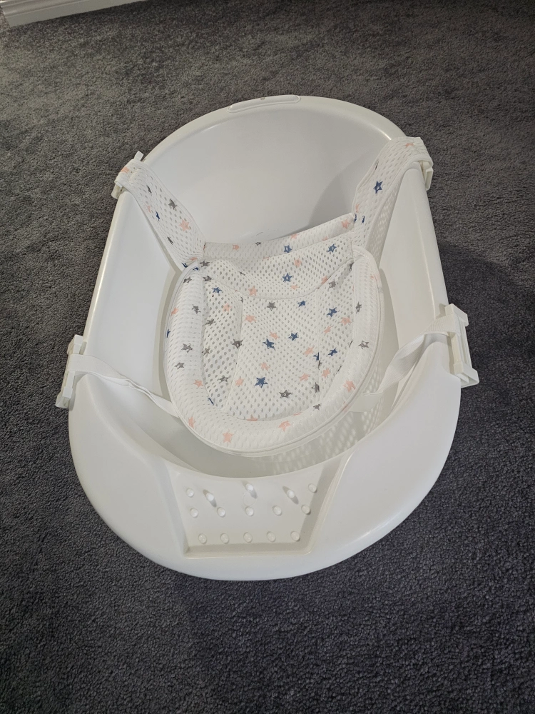 Selling a baby bathtub in great condition. It comes with a mesh sling to support your little one during bath time. The tub is white and the sling has a cute star pattern on it. It’s perfect for newborns and infants!