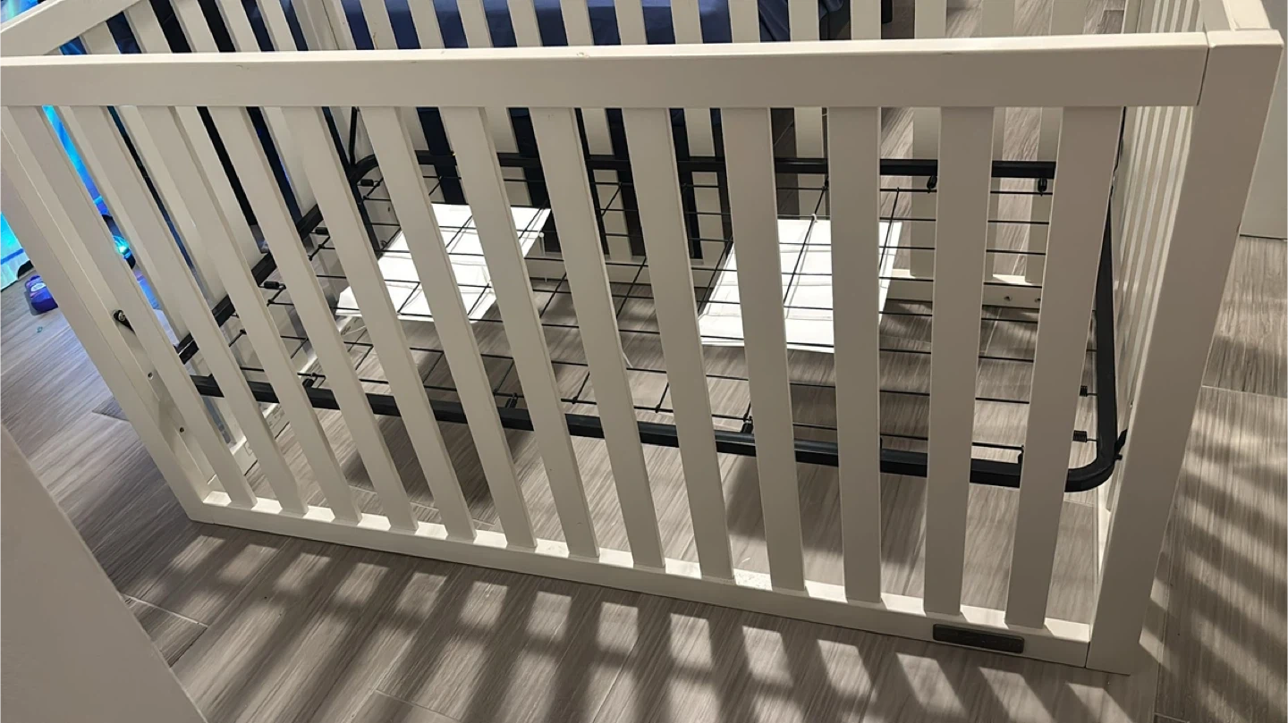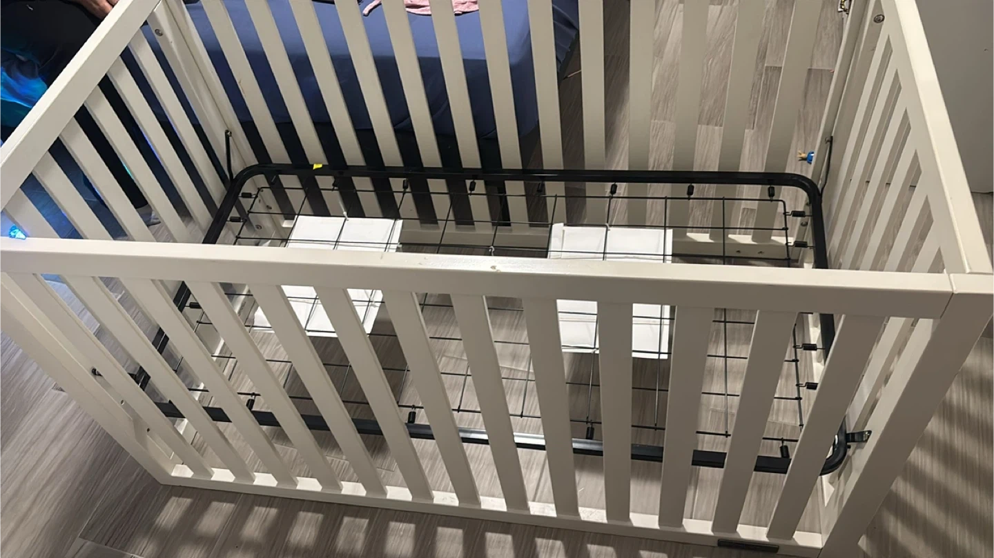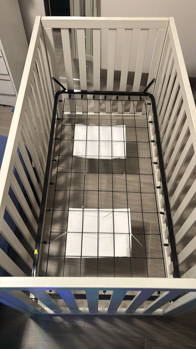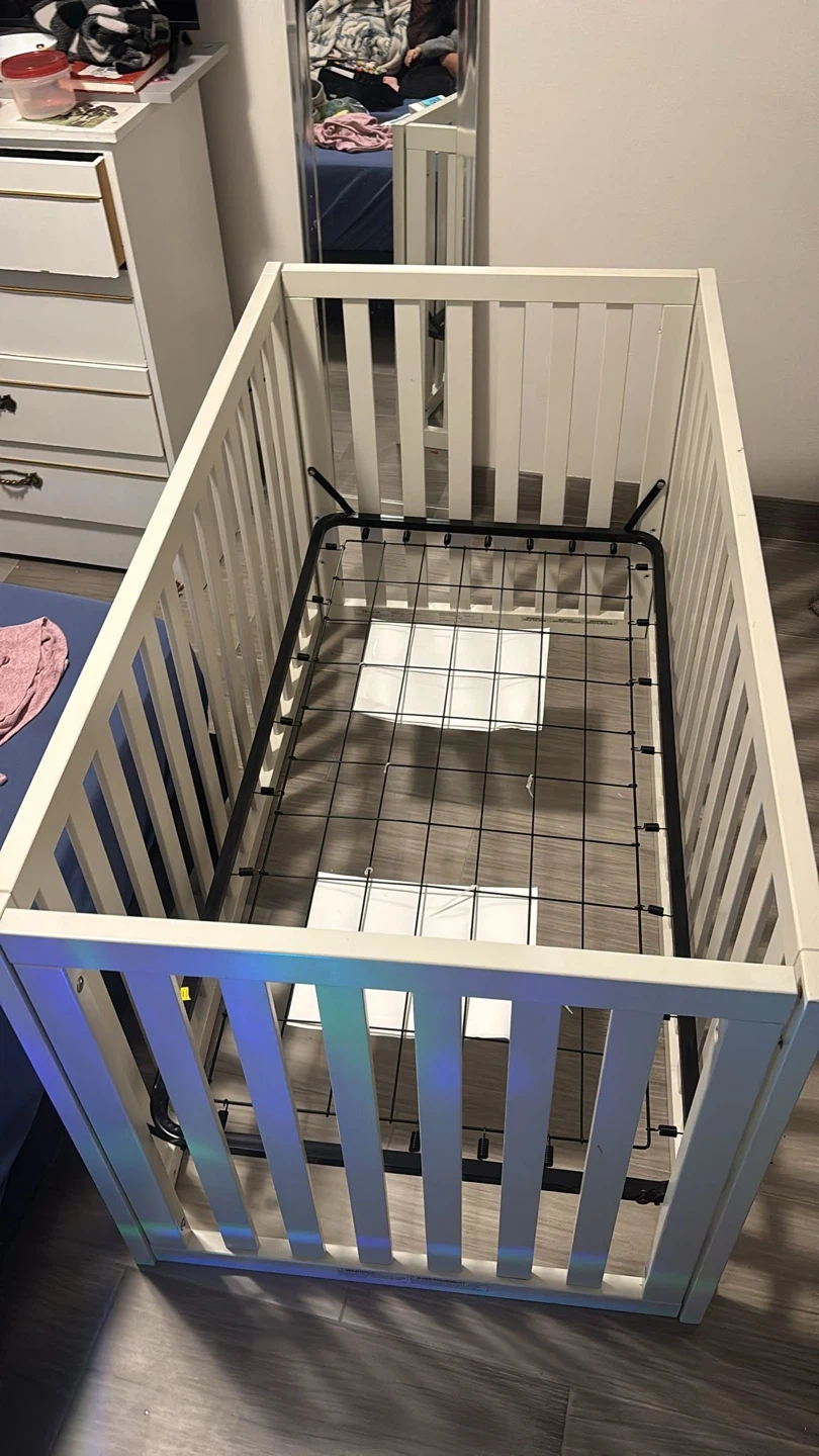 60Selling a baby crib in great condition! It's a lovely white colour that would fit into any nursery. The crib has a sturdy frame and is ready for a new little one. And comes with three sheets, a mattress cover, and two Crib dust ruffle