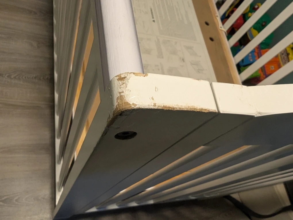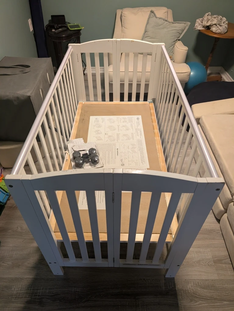 60Selling a Dream on me, full size folding crib in white. 2 adjustable mattress heights. It's in good condition, perfect for your little one. There are some signs of wear on the edges, as shown in the photos from being pulled and out of the car.