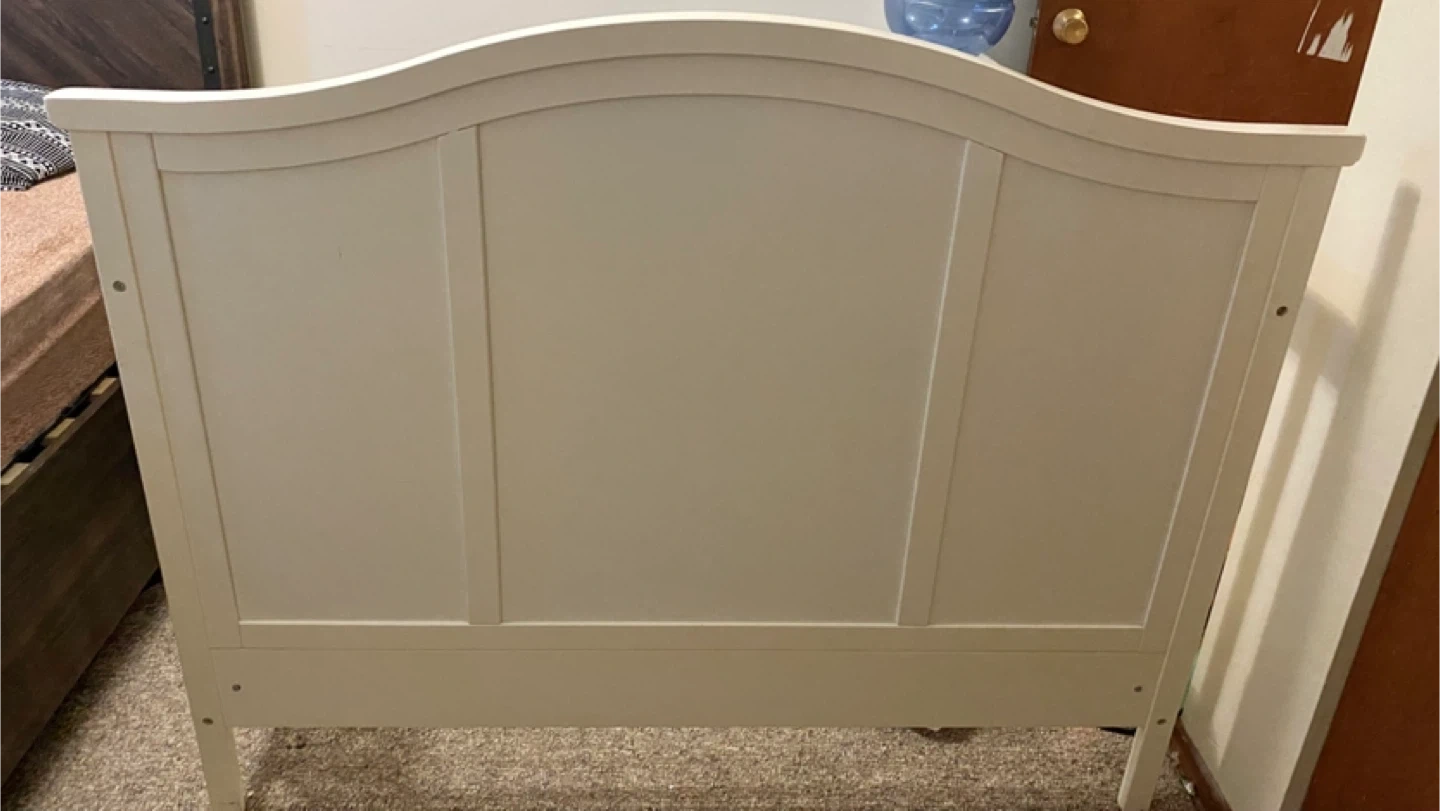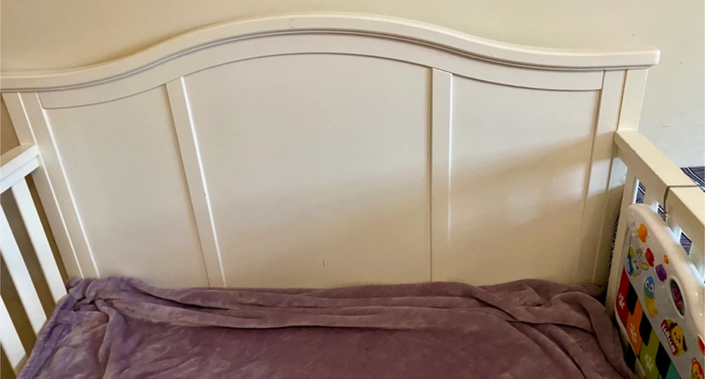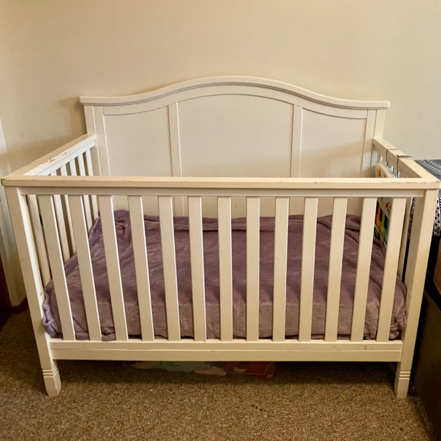 Selling a baby crib in white. It shows some signs of wear and tear, as seen in the pictures. no missing screws