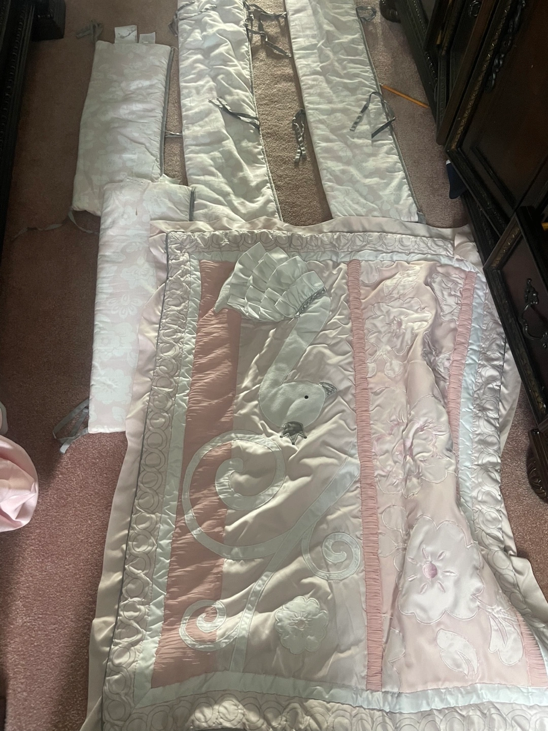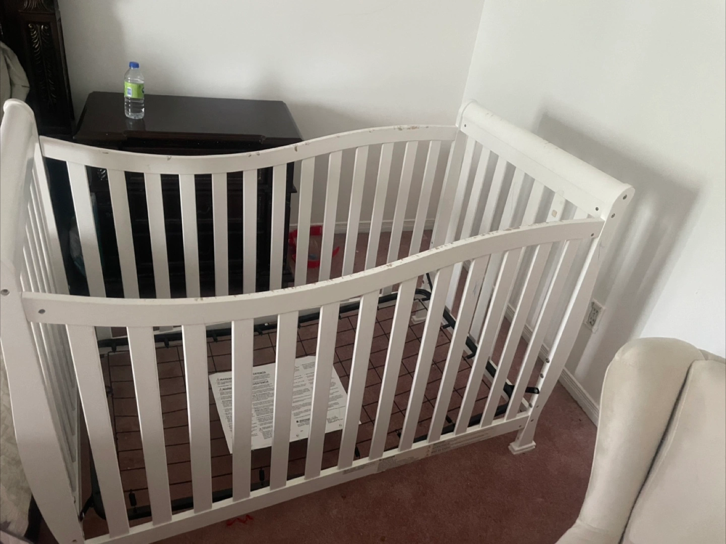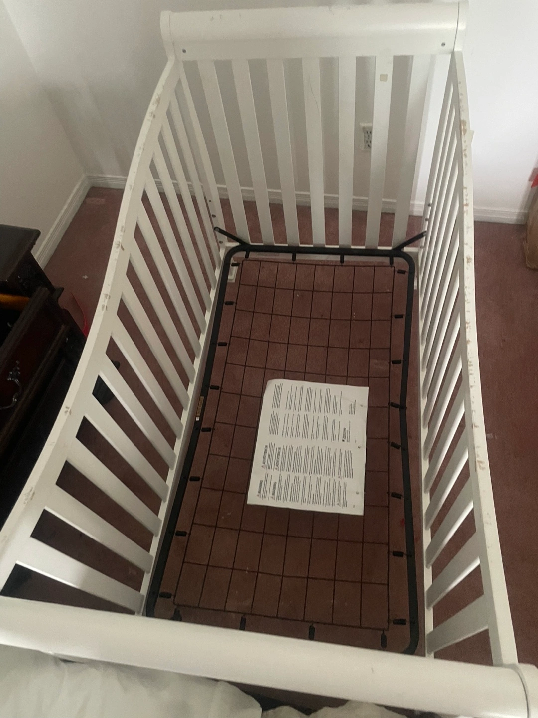 Selling a white baby crib it’s has scratch on the top which can easily be painted except that its in great shape! It comes with bedding set as shown in the photos. Perfect for your little one's nursery and free mattress that’s in a very good condition it’s has been disassembled pickup only