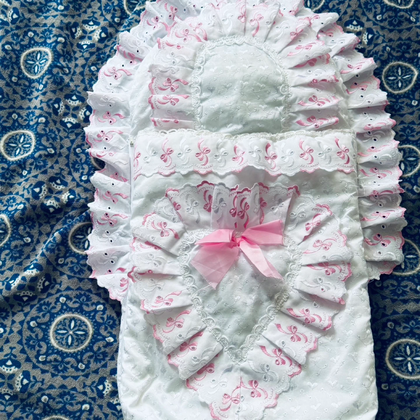 16Selling a gently used white baby sleeping bag. It features delicate white lace and a pretty pink bow. Perfect for keeping your little one snug and warm!
