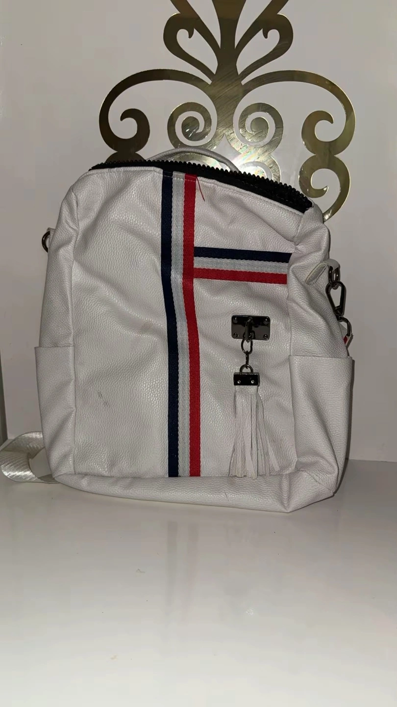 A cute white backpack with red, white, and blue stripes! It has a tassel and some minor signs of wear as pictured.