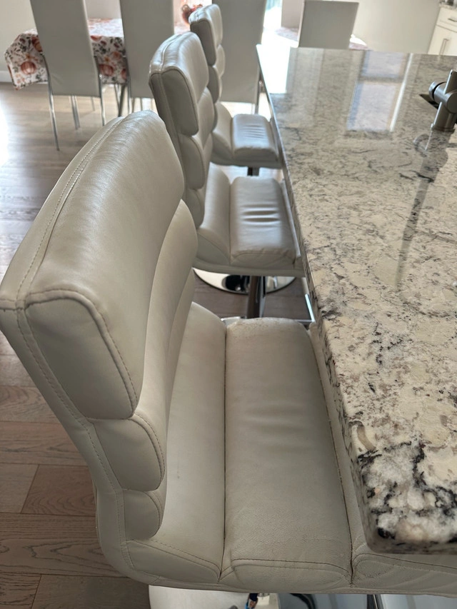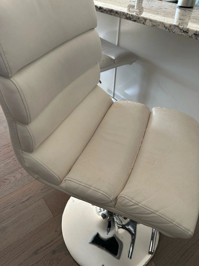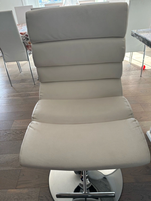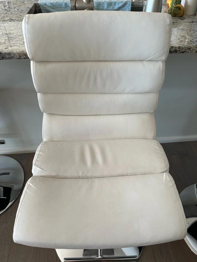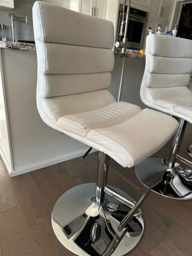 These are used white bar stools with a sleek design, perfect for any modern kitchen or bar area. Their adjustable height and swivel feature add to the comfort and versatility. There are some signs of wear, as visible in the photos, but they remain in good condition and fully functional. Here are some specs: * Adjustable Height * Swivel Function * Chrome Base * Padded Seat * Contemporary Design I think a fair price for these chairs is $30 each If the ad is up, they're still available!