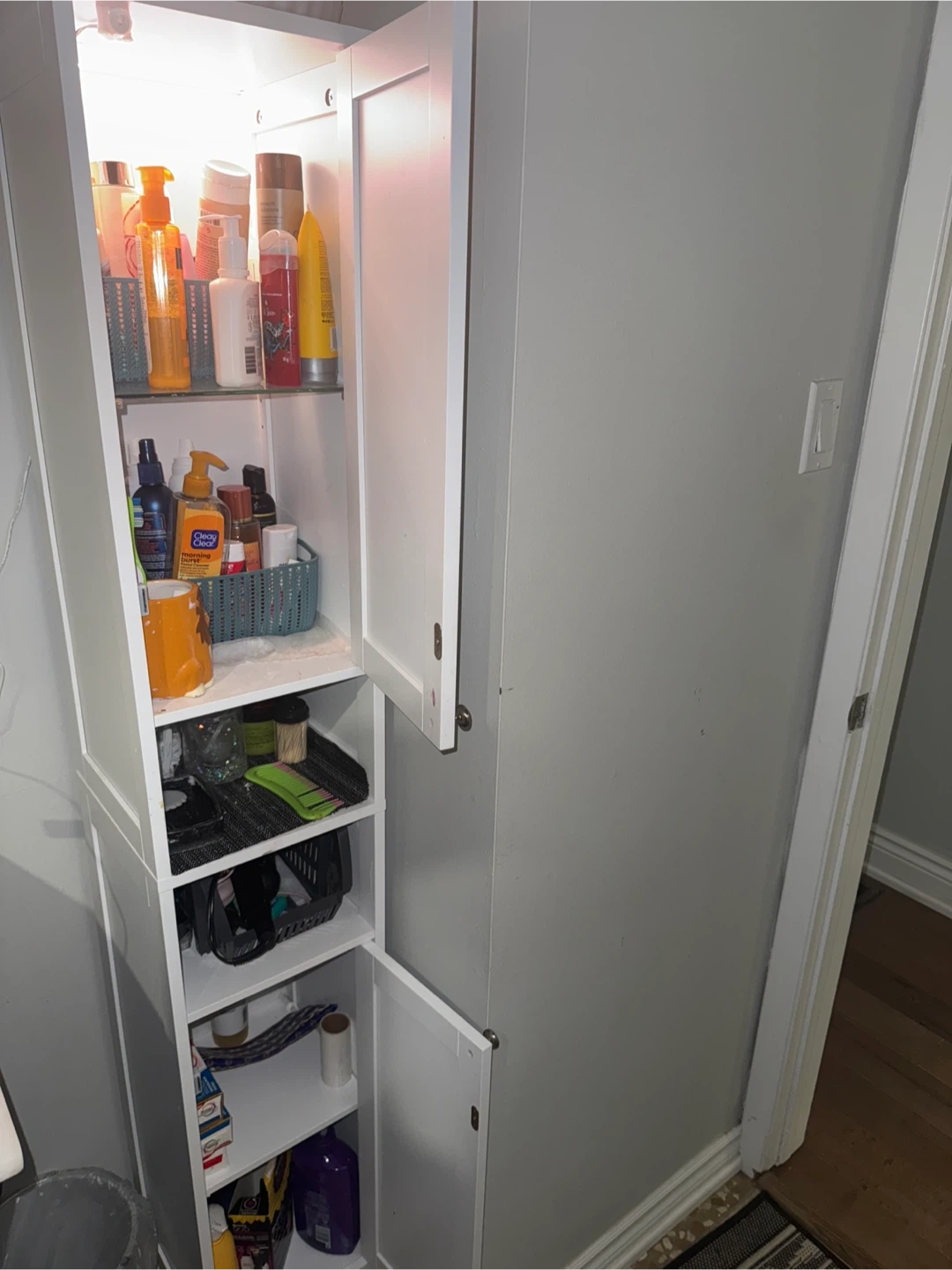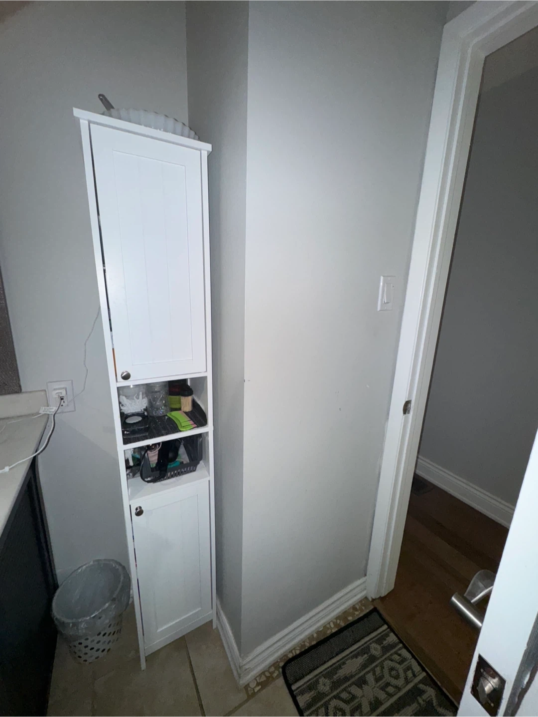 I'm selling a white bathroom storage cabinet. It's perfect for keeping your bathroom organized and tidy. It has multiple shelves to store all your essentials. It's in great condition and ready for a new home