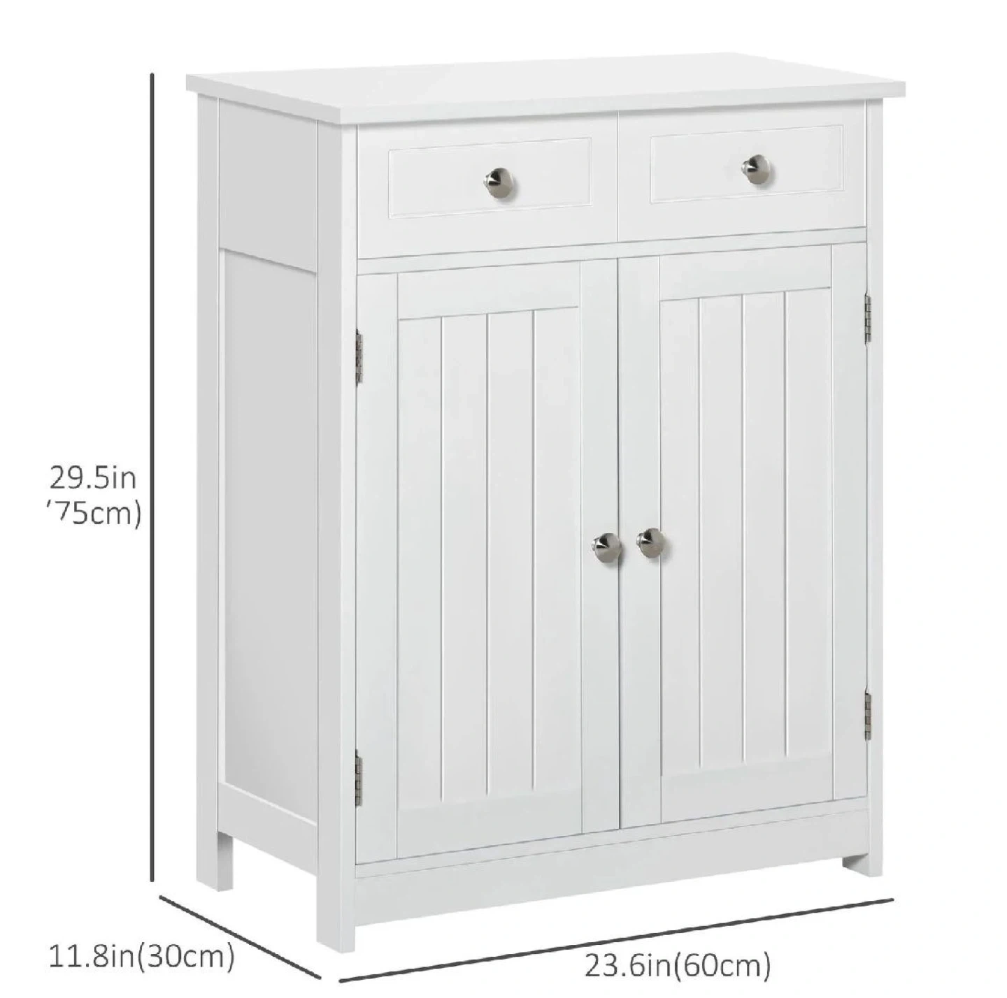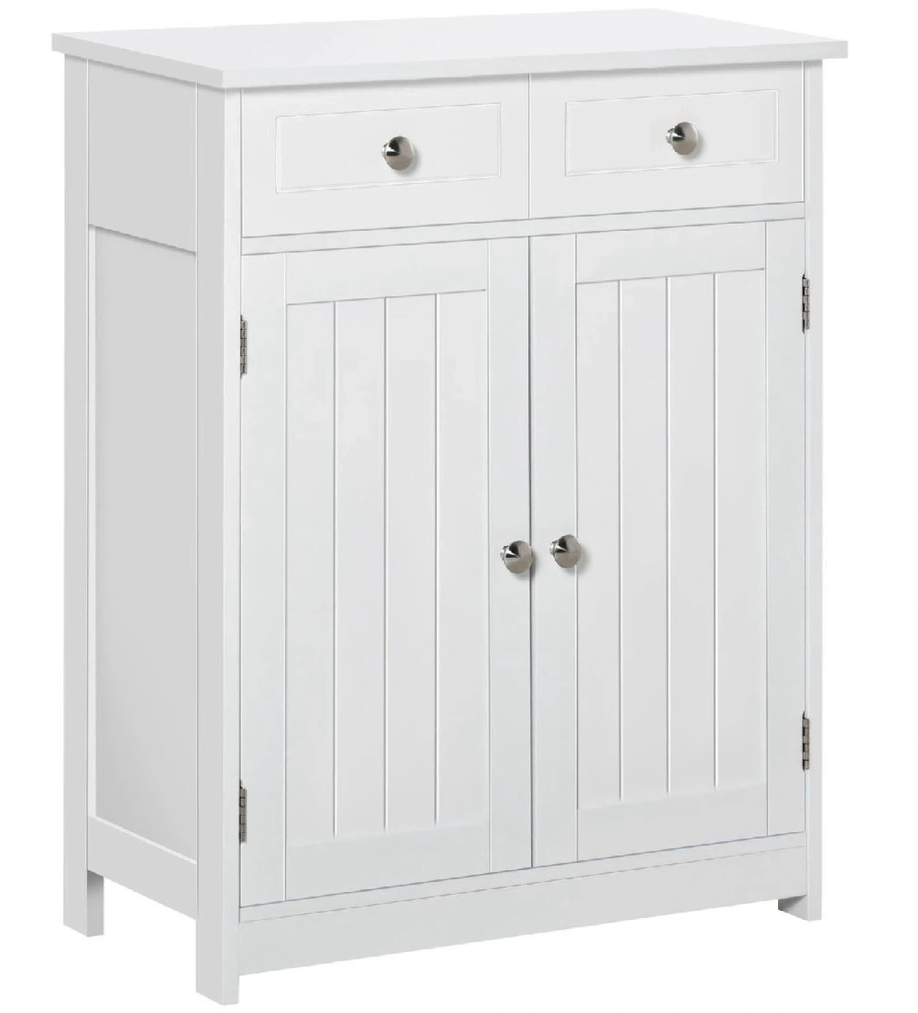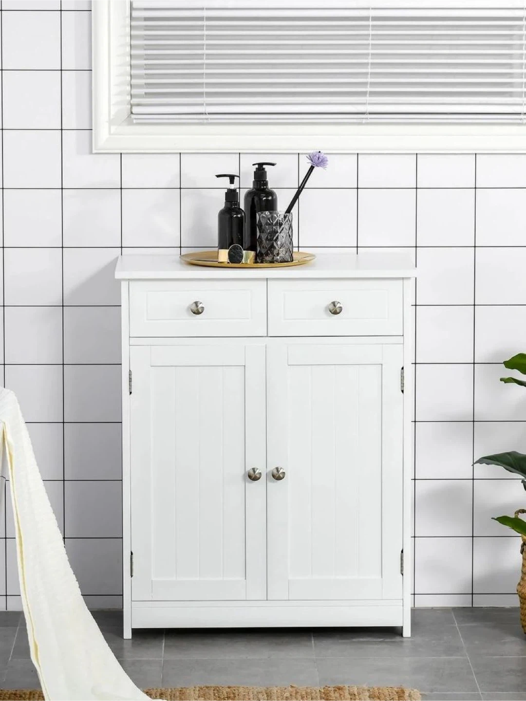 Looking to add some extra storage to your bathroom? This white cabinet is perfect! It features two drawers up top and a cabinet below, giving you plenty of space for all your essentials. The dimensions are approximately 29.5 inches tall, 23.6 inches wide, and 11.8 inches deep.