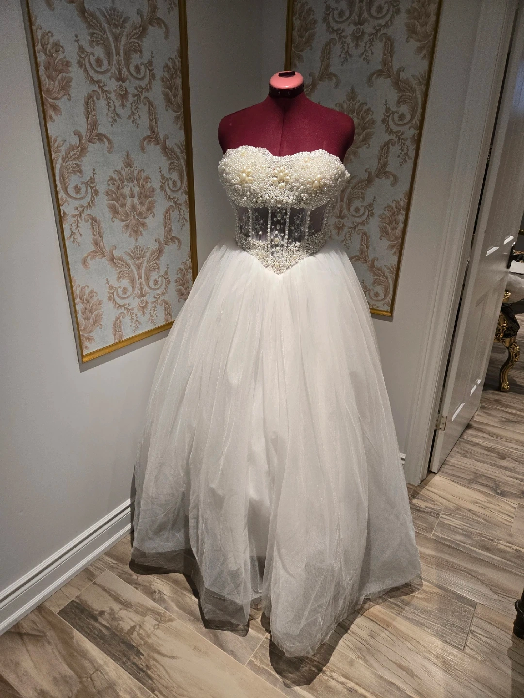 60Gorgeous white wedding dress with pearl beaded detailing. This dress is NEW and ready for its next special day!