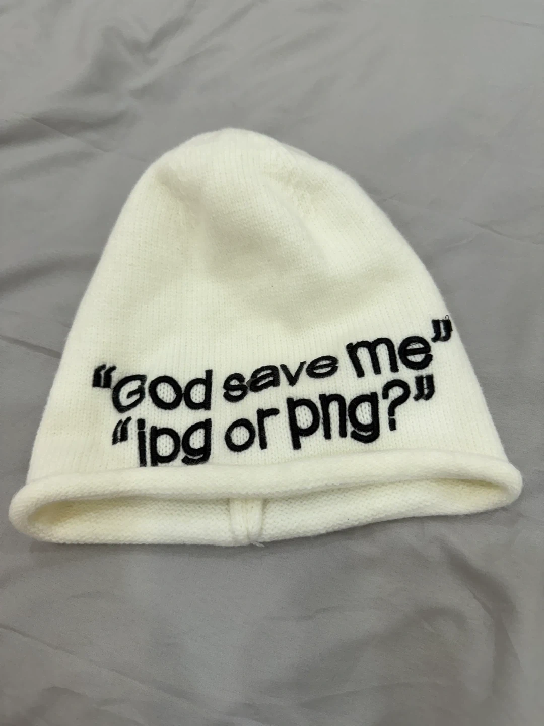 Selling a white beanie with the text "God save me" and "ipg or png?" embroidered on it. It's in great condition and ready to keep you warm!