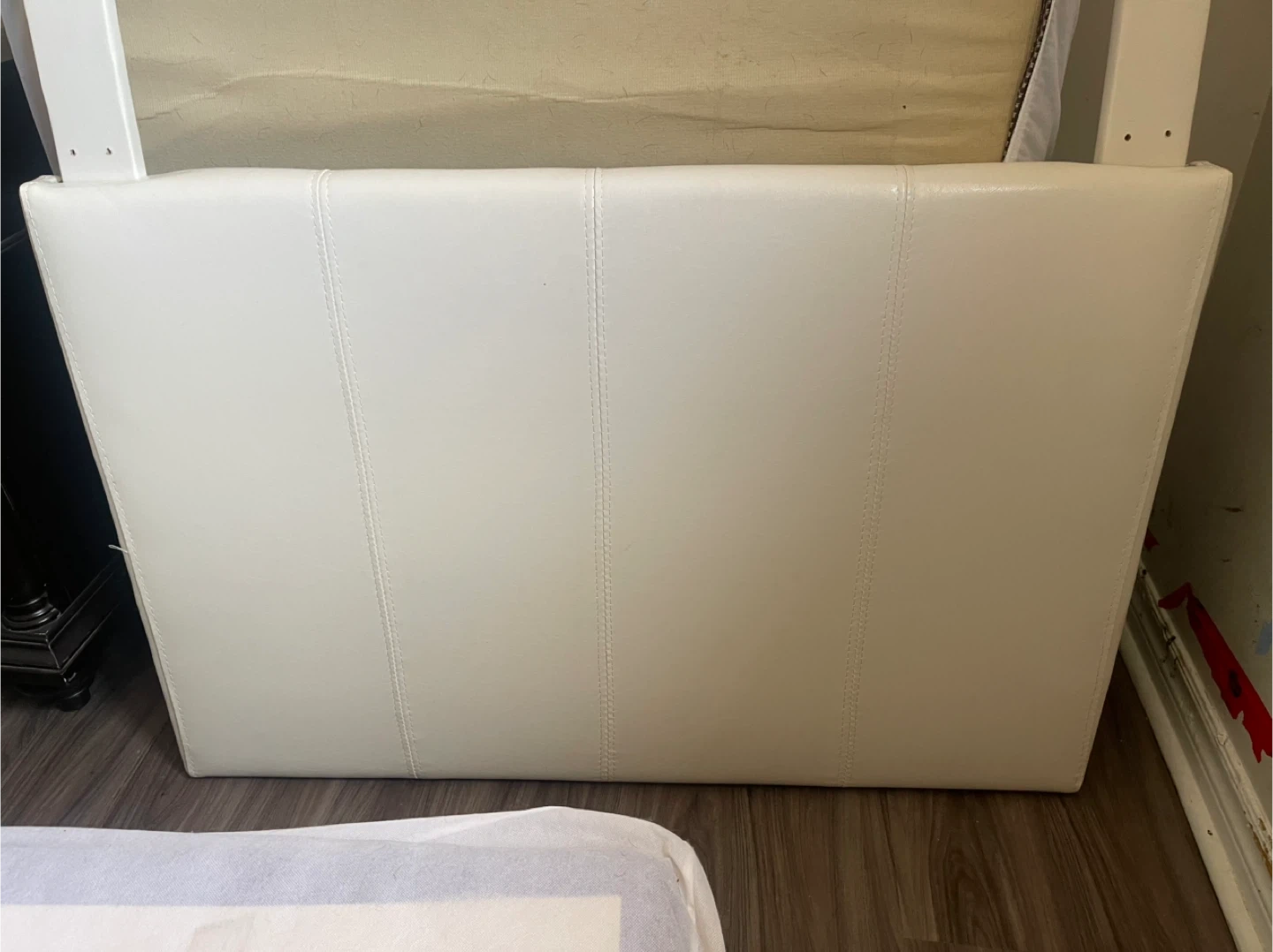 Selling a used white bed frame. It has some signs of wear, but is still in good condition. Perfect for a guest room or someone looking for an affordable bed frame and headboard mattress and box spring included