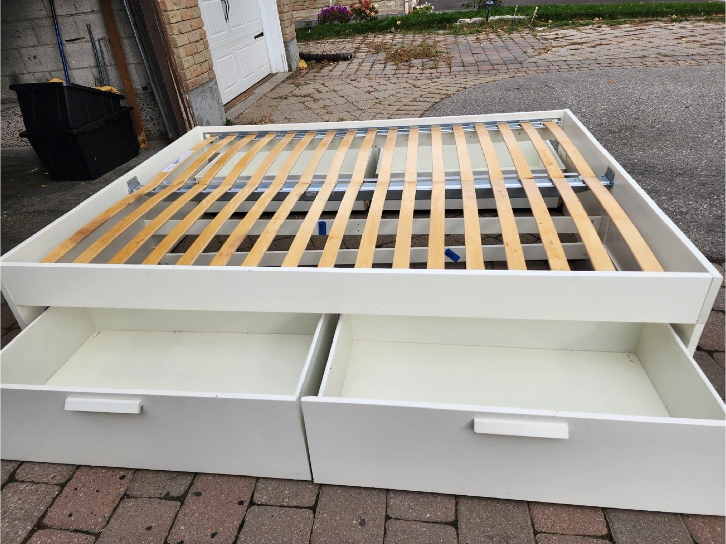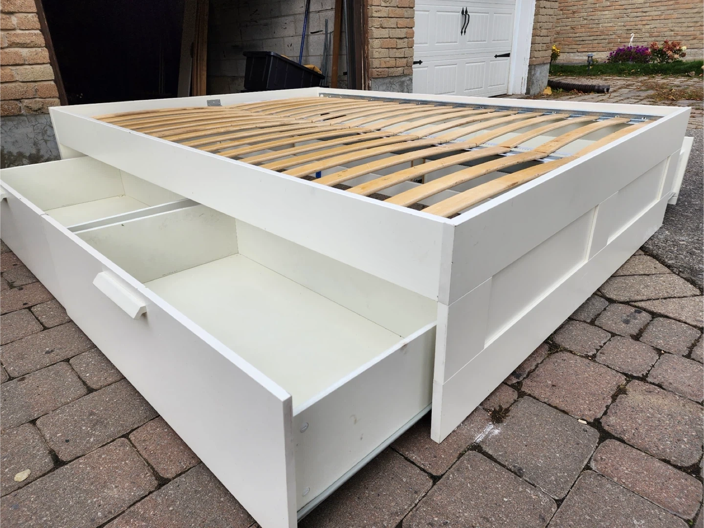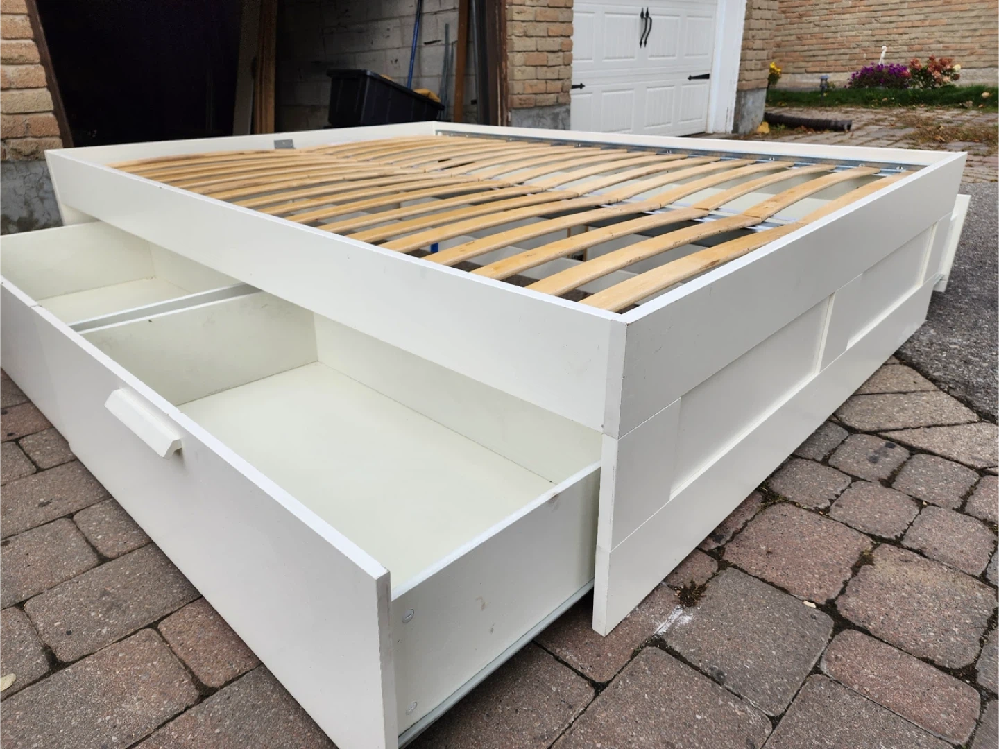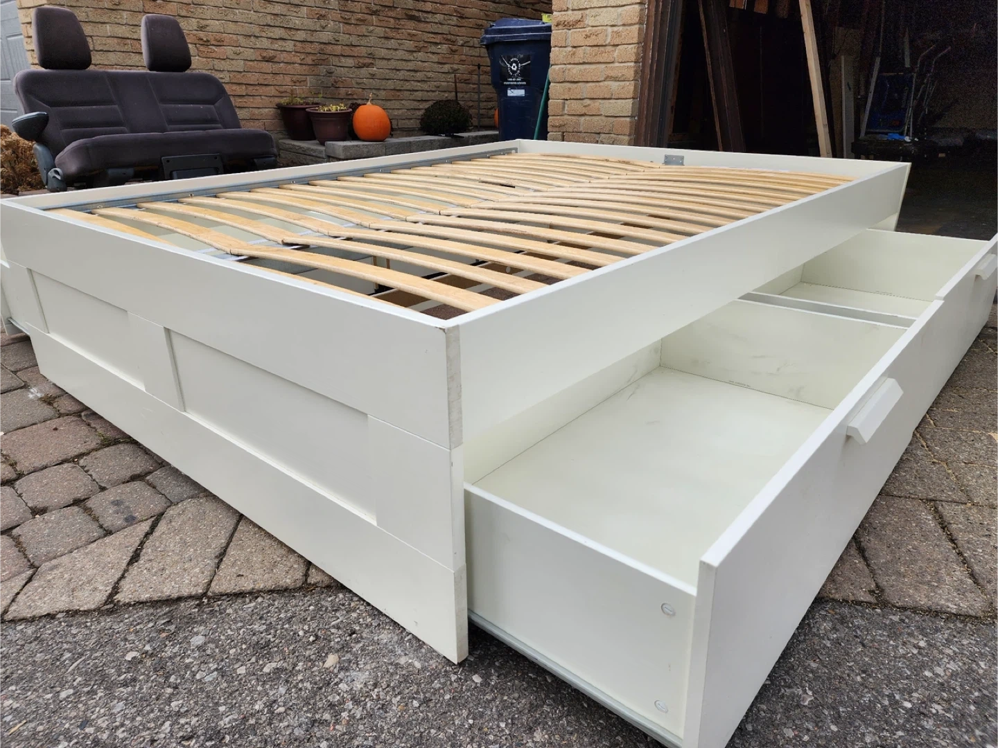 Selling a bed frame with built-in drawers for extra storage! It's in great condition and would be perfect for adding some organization to your bedroom. The frame is white and has two spacious drawers on one side. A great way to maximize space!