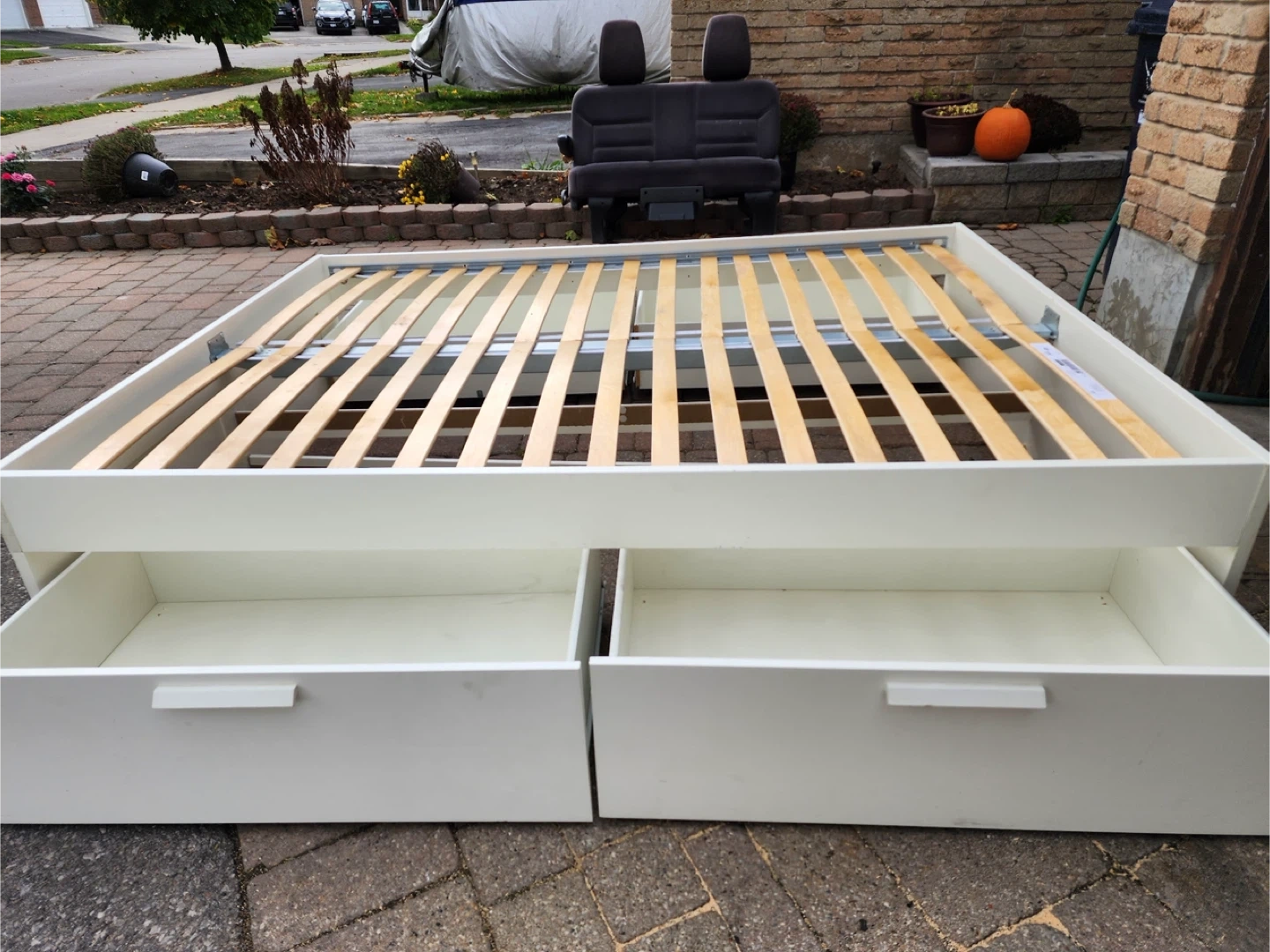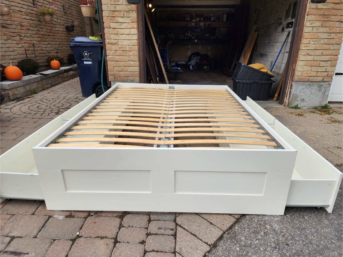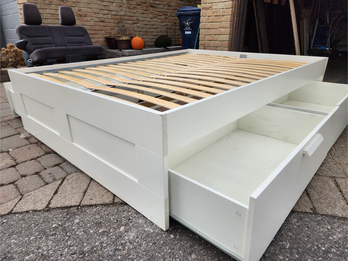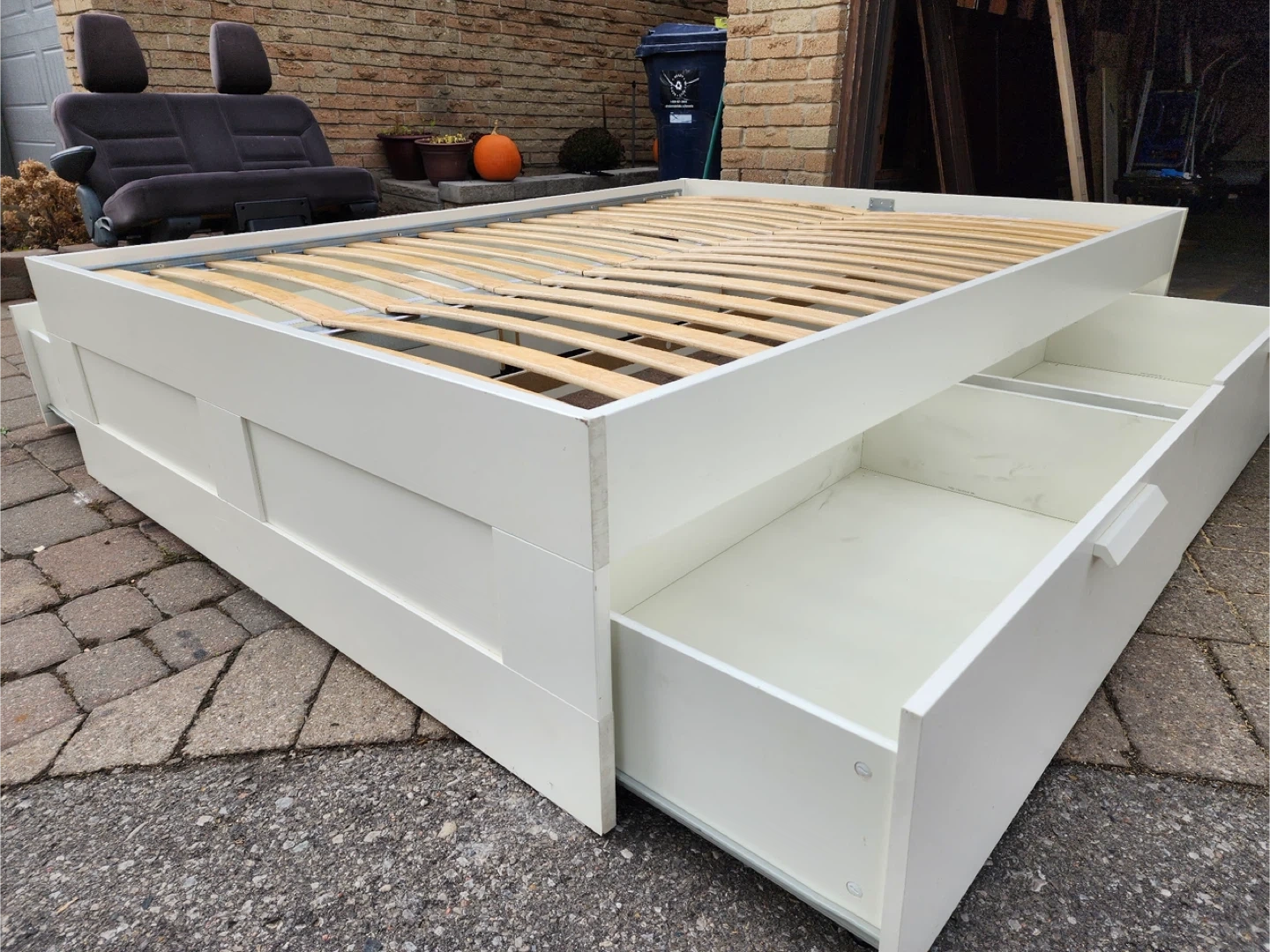 Selling a bed frame with built-in drawers for extra storage! It's in great condition and would be perfect for adding some organization to your bedroom. The frame is white and has two spacious drawers on one side. A great way to maximize space!