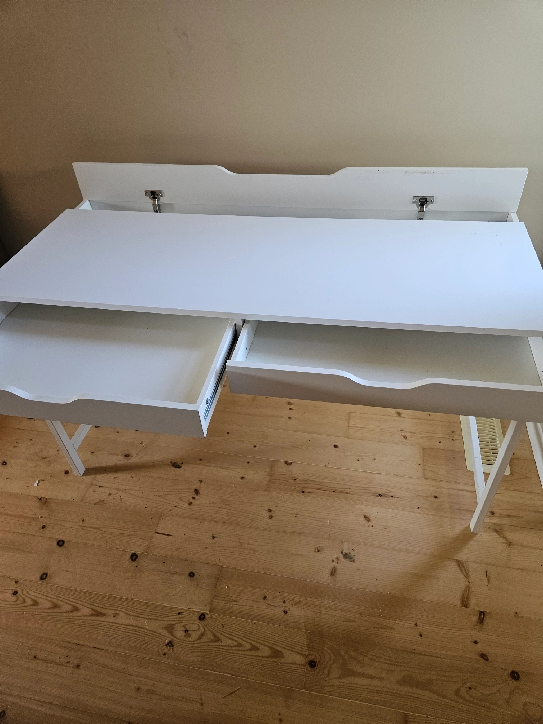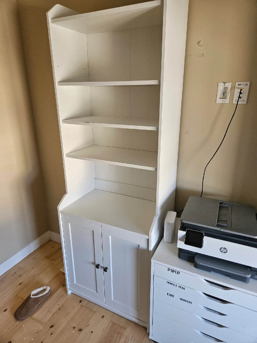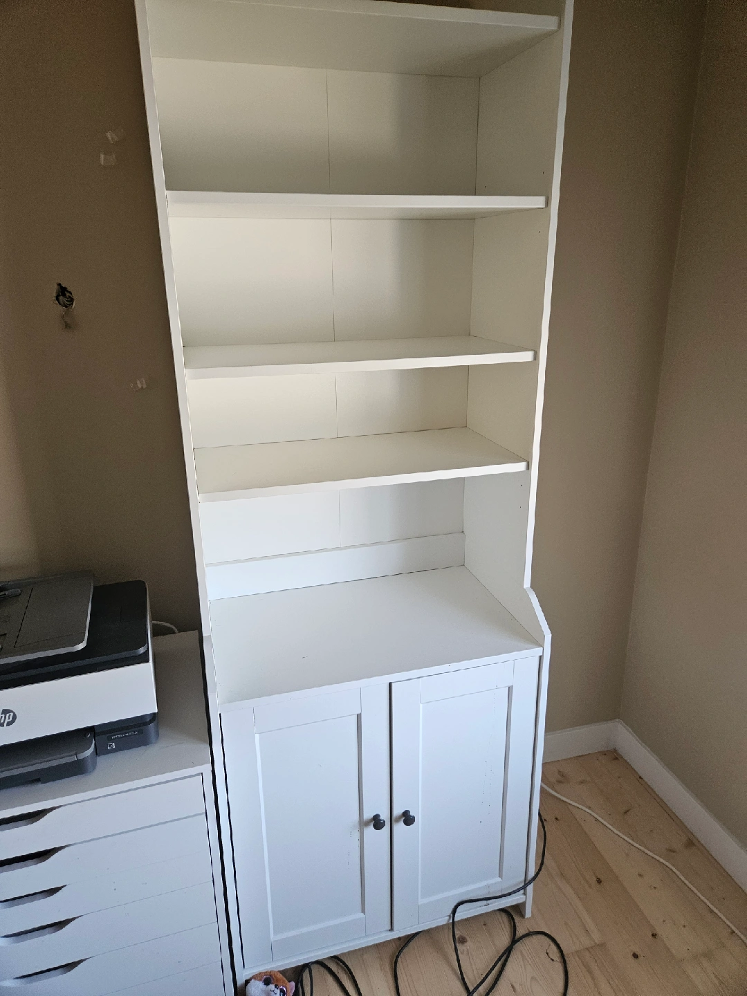Selling a white bookcase with doors and a white desk. Both are in good condition and would be perfect for a home office or study space. The bookcase offers ample storage with shelves and a cabinet, while the desk has drawers for organization