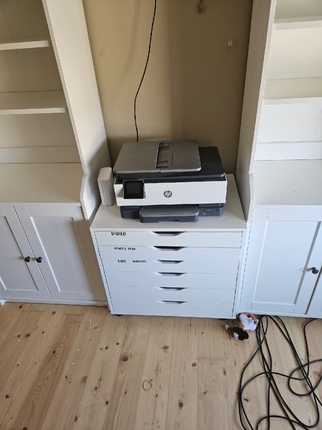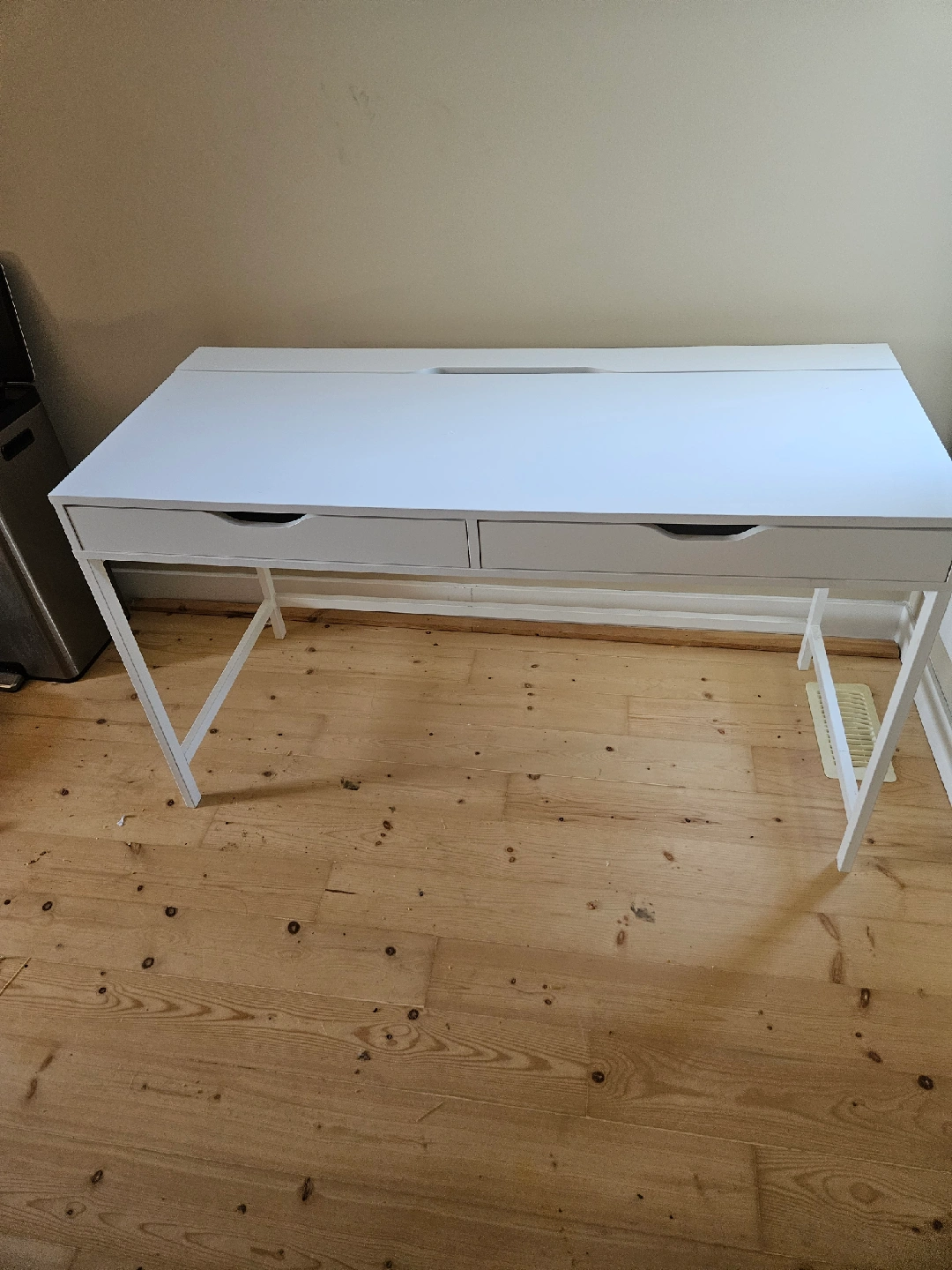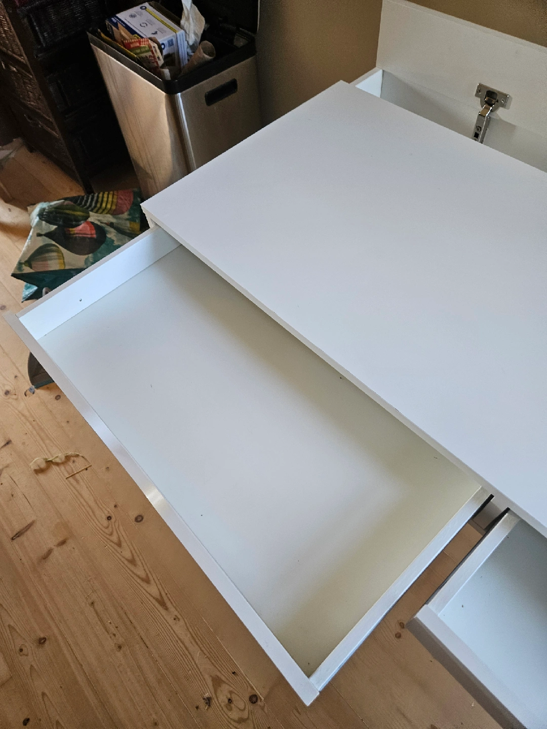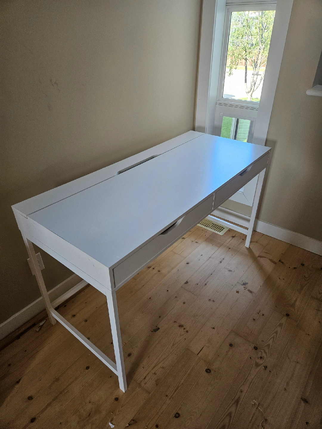 Selling a white bookcase with doors and a white desk. Both are in good condition and would be perfect for a home office or study space. The bookcase offers ample storage with shelves and a cabinet, while the desk has drawers for organization