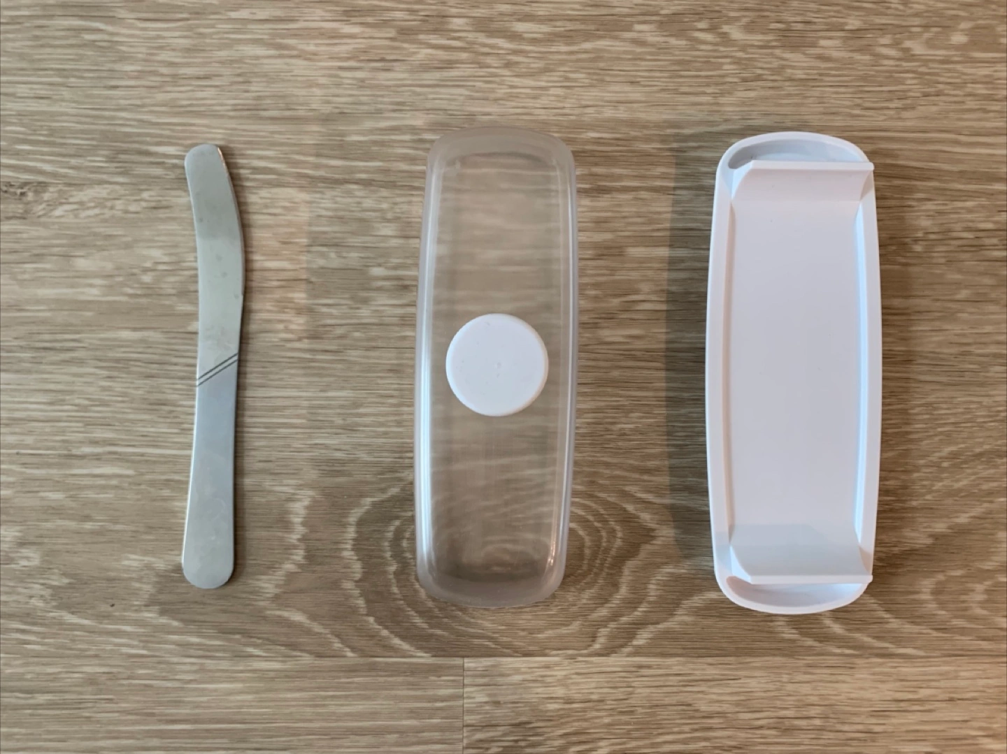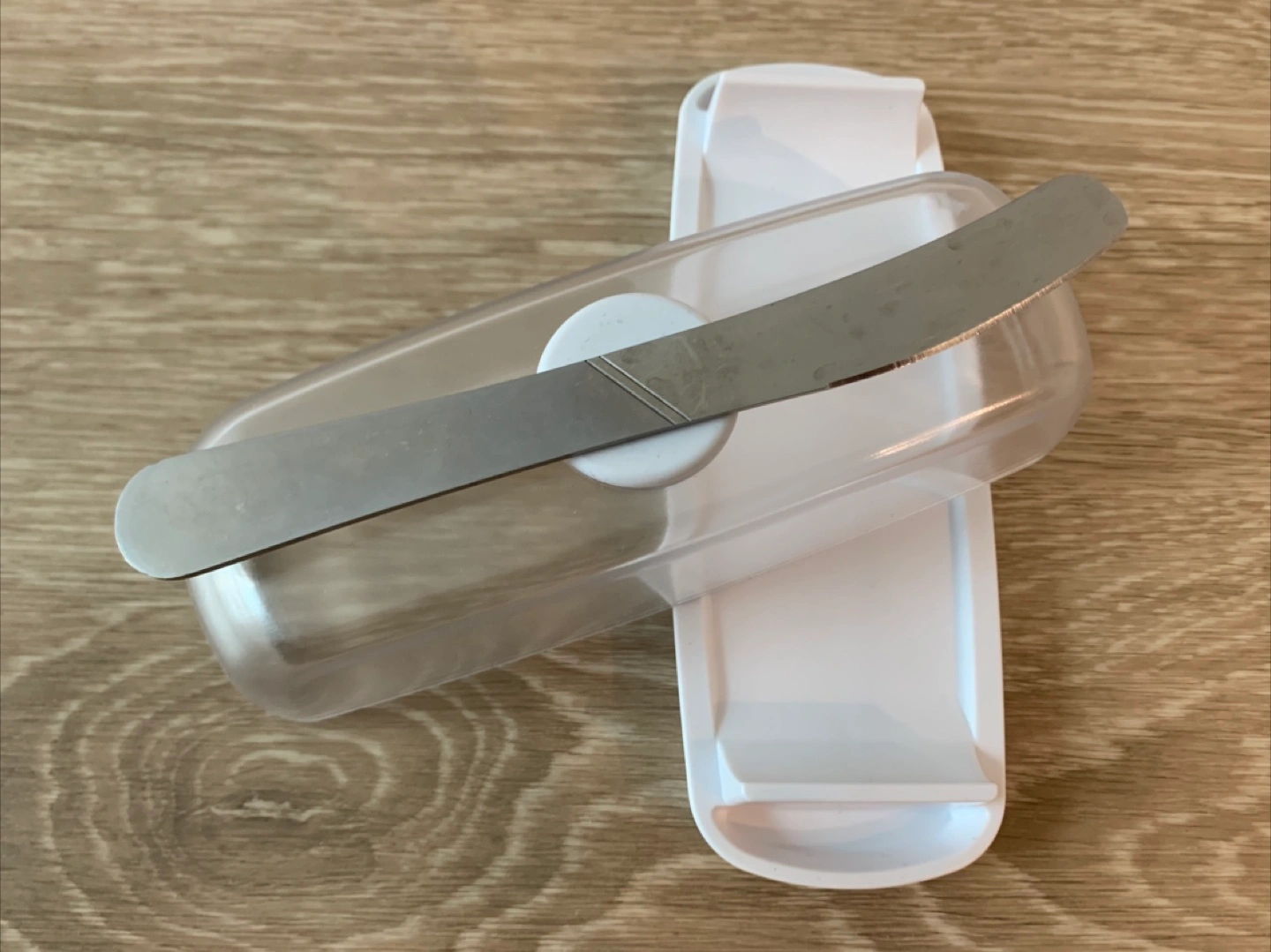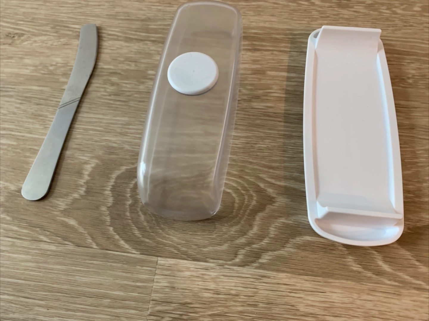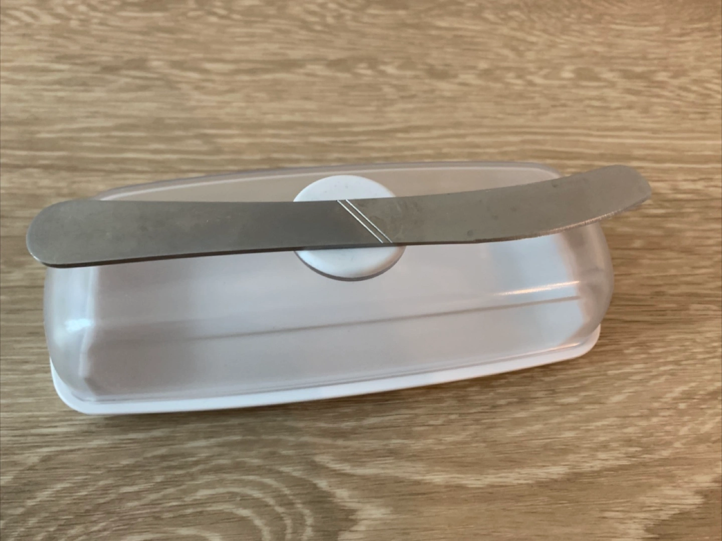 Butter dish that includes a lid and magnetic knife that attaches to the top. Pickup and cash only.