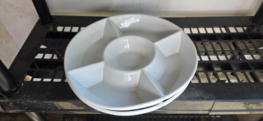 Selling a white ceramic appetizer serving plate. It's perfect for serving dips, snacks, or appetizers at your next gathering. It features a central bowl for dips and surrounding sections for other goodies. It's in good condition and ready for a new home!
