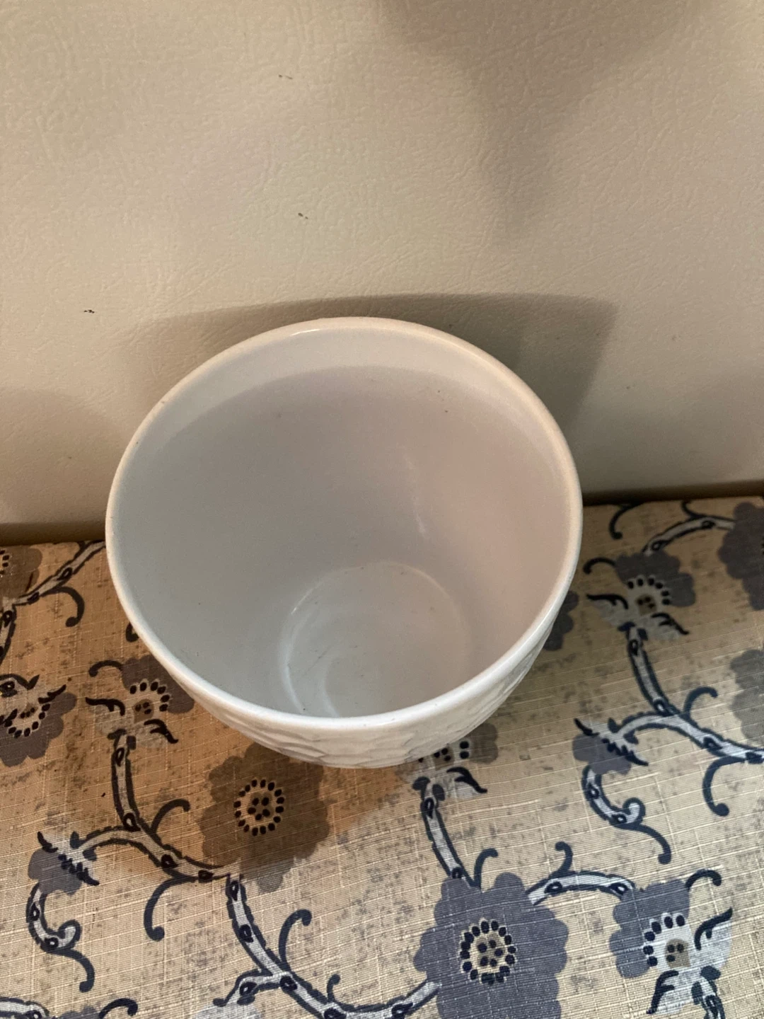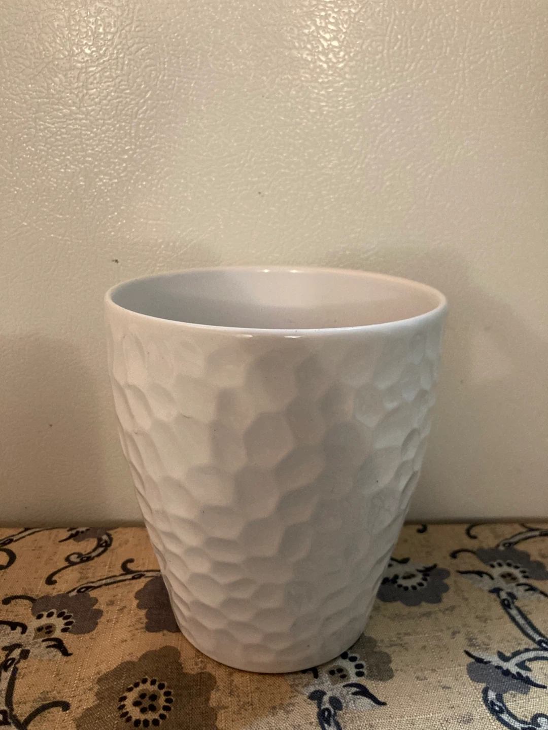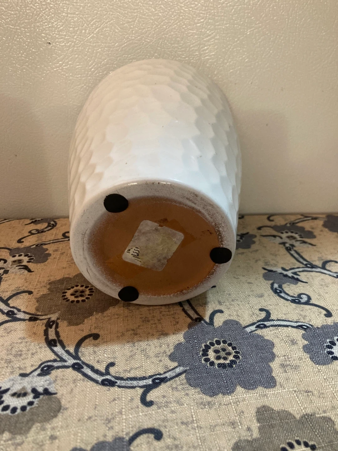 60Here's a cute white ceramic flower pot! It's in great condition and ready for a new home. It has a unique, textured pattern that adds a nice touch to any room. Perfect for small plants or succulents