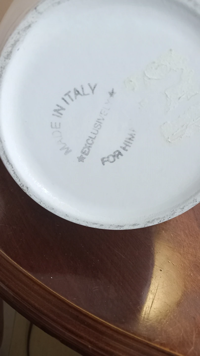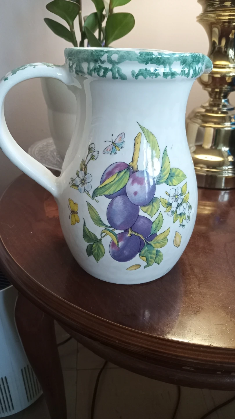 Here's a lovely white ceramic pitcher, perfect for serving drinks or displaying flowers. It has a charming plum design with butterflies and a green leaf pattern around the rim and handle. It is marked "Made in Italy Size 8 in high. Mouth opening 5 in