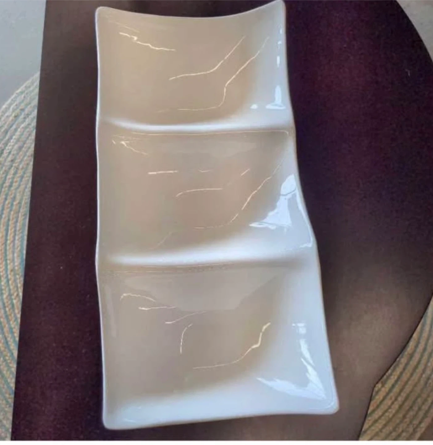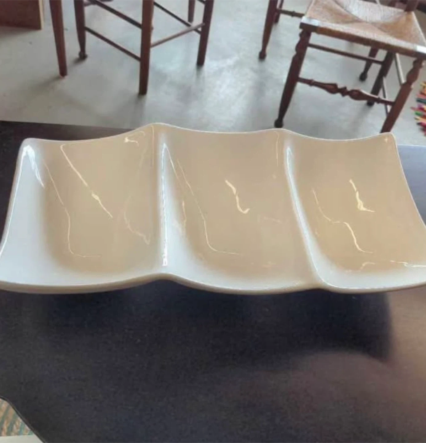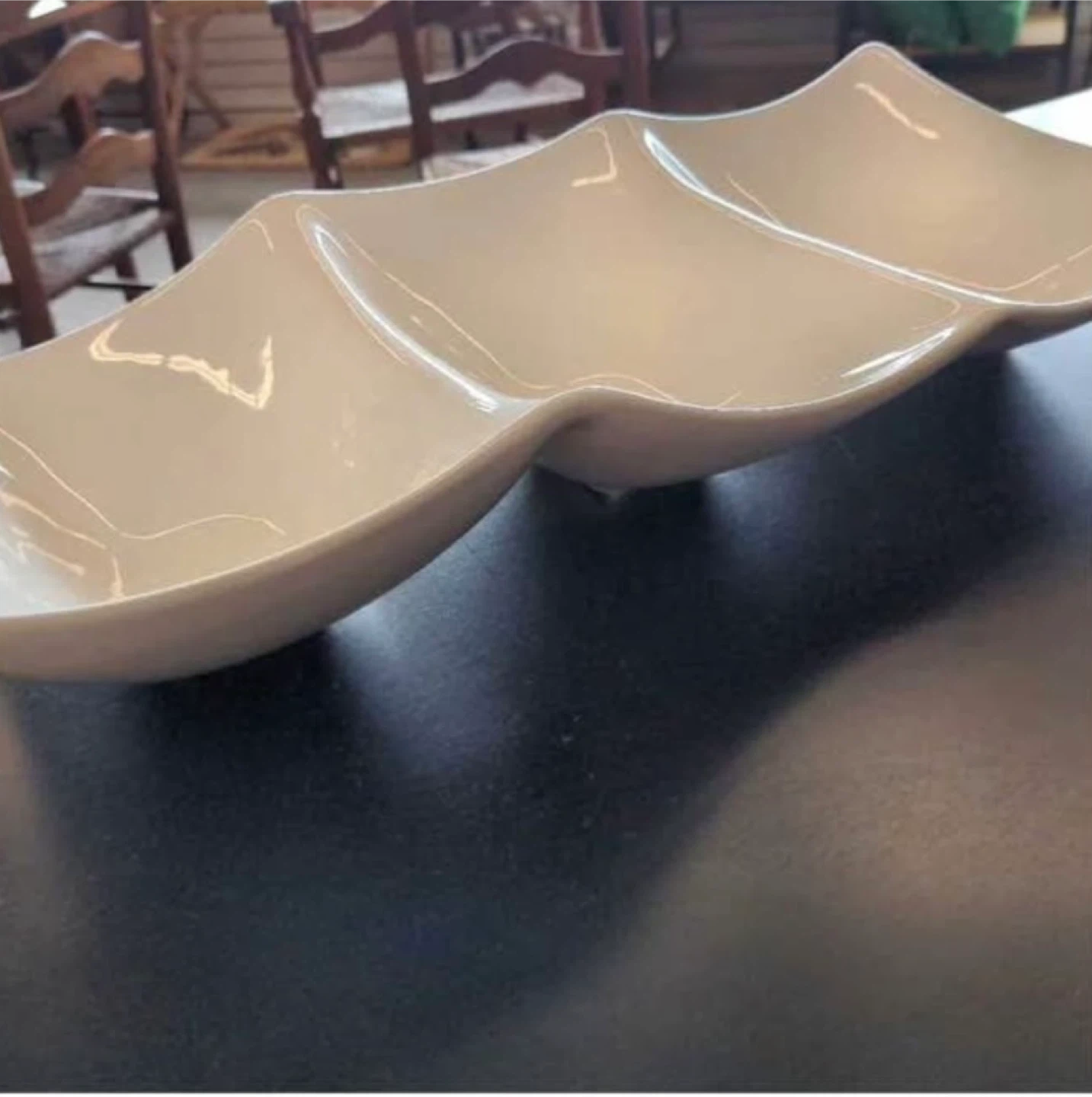 Selling a lovely white ceramic serving dish! It features a unique, wavy design with three divided sections, perfect for appetizers, snacks, or condiments. This dish is in great condition and would be a stylish addition to any table setting