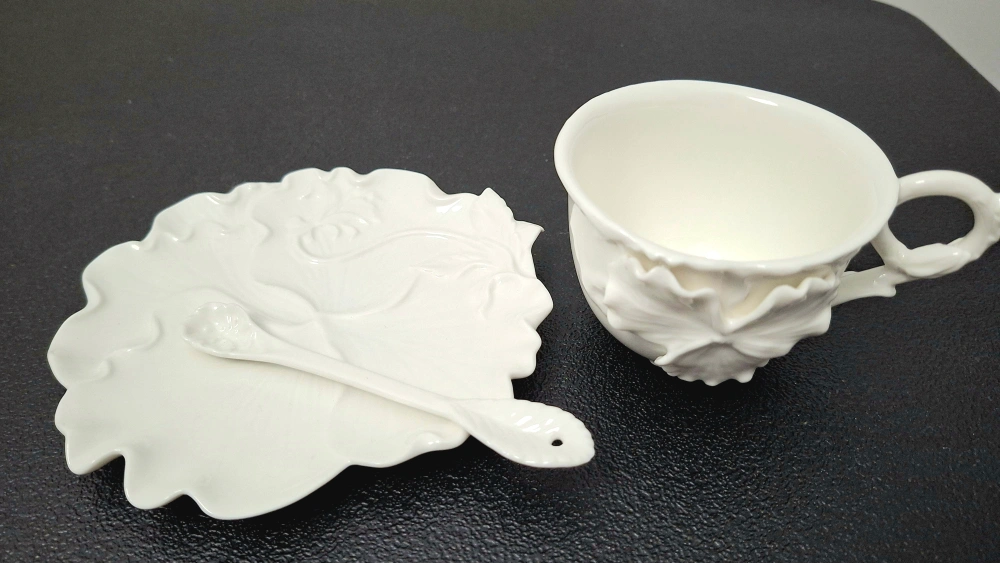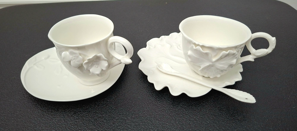 Here's a lovely white ceramic teacup and saucer set. It features a delicate floral design. Perfect for enjoying your favourite tea or coffee in style!