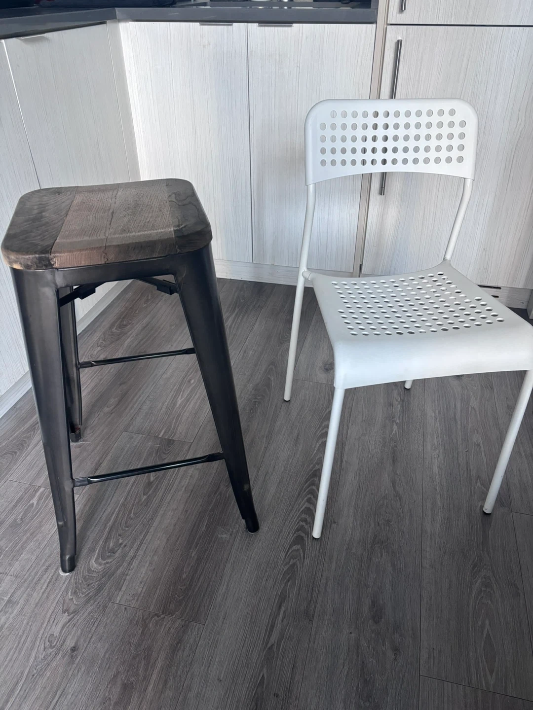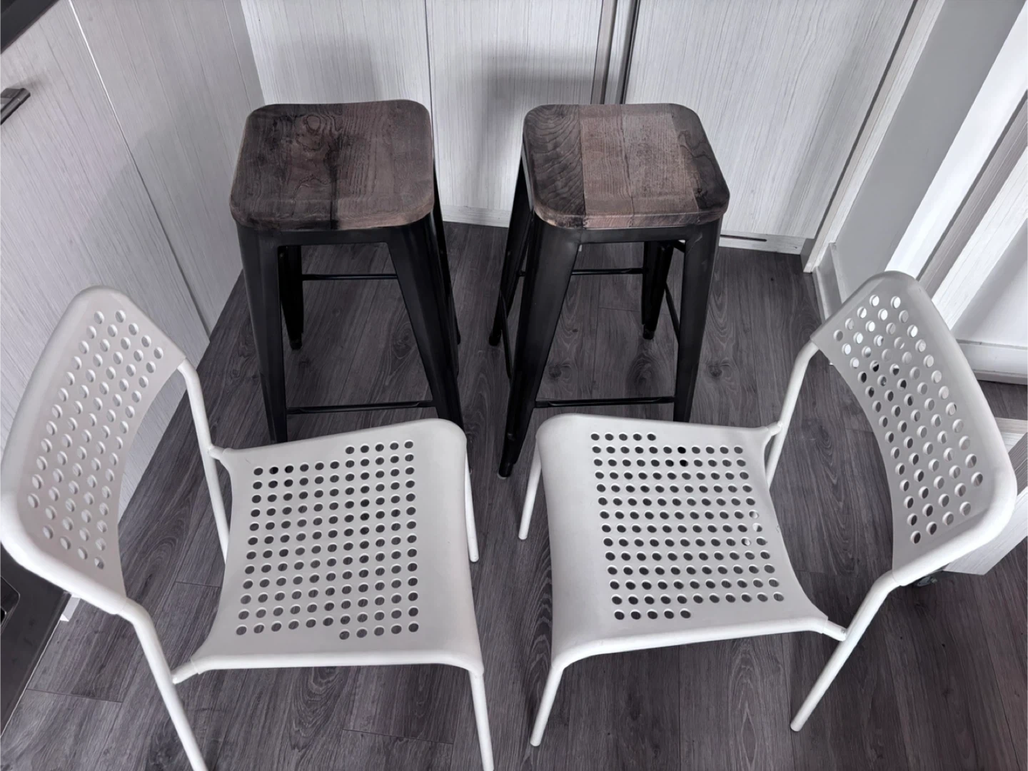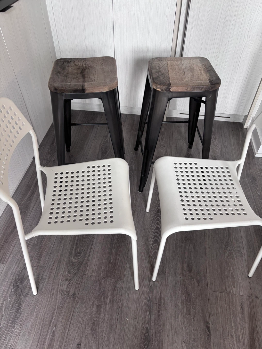 60Selling Two bar stools with a wooden seat and black metal legs. The other two are white plastic chairs. Price is for all 4 items.