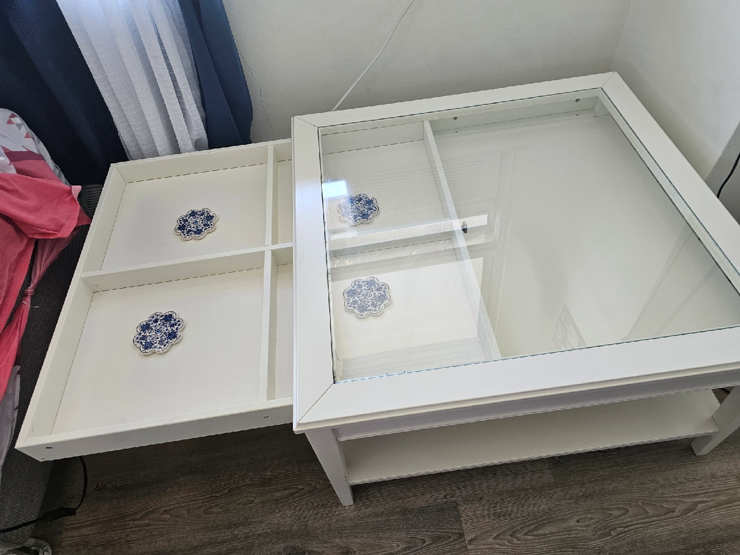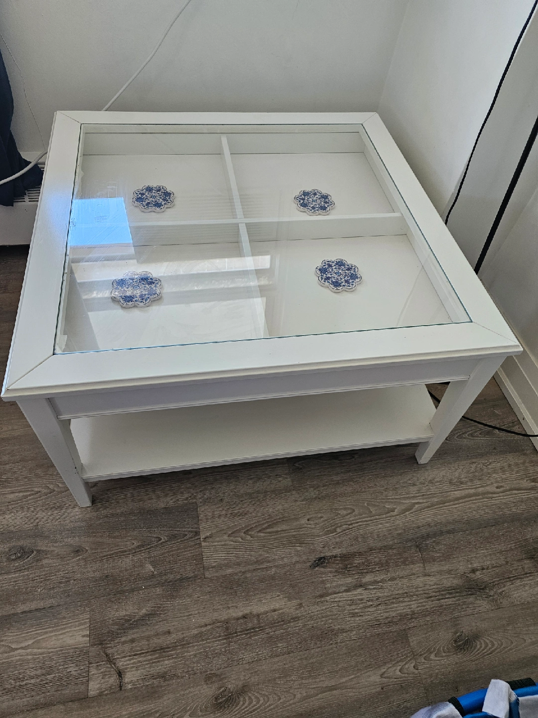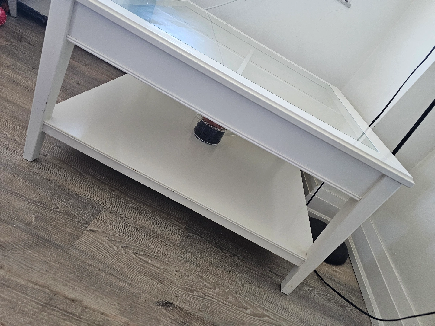 Looking to sell this coffee table! It features a glass top and a convenient storage shelf underneath. The table is white and in good condition. Great for adding a touch of elegance and functionality to your living room!