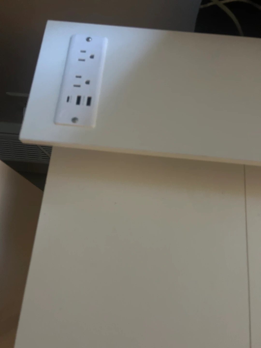 10Selling a white computer desk that's perfect for a home office or study space! It features a built-in power outlet with USB ports, which is super handy for charging your devices. There's some minor wear and tear (see the photos), but it's still sturdy and functional. Great for small spaces