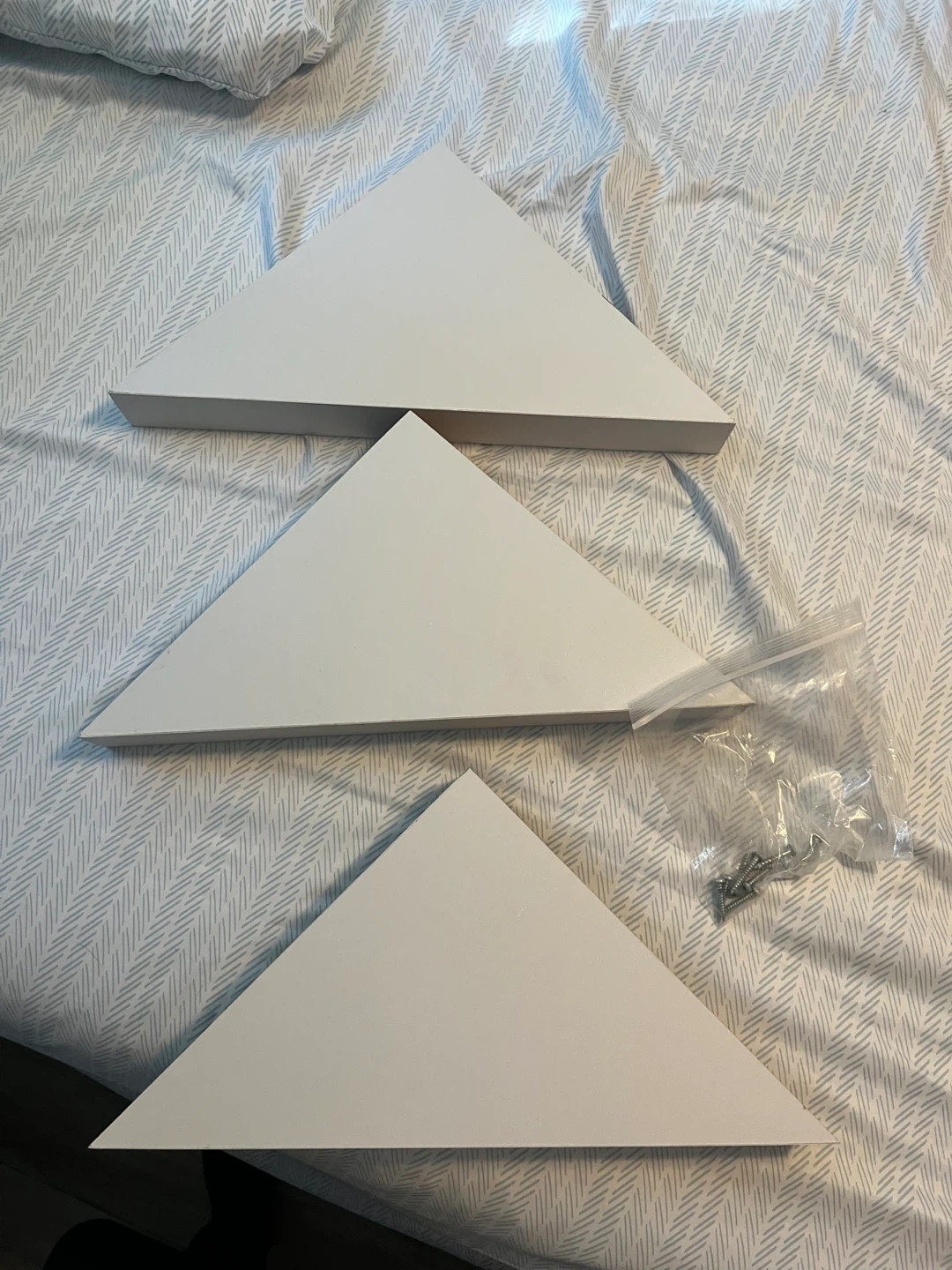 5Selling a set of three white corner shelves. They're in great shape and come with the mounting hardware. Each shelf measures approximately 16 inches along the longest side and 8 inches in height. Perfect for adding a bit of storage to any corner!