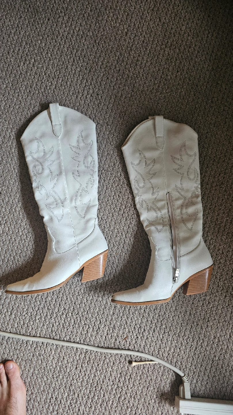 Selling a pair of white cowboy boots. They're in great shape and ready for a new home! The boots feature a stylish design and a comfortable heel height. Perfect for adding a touch of western flair to any outfit