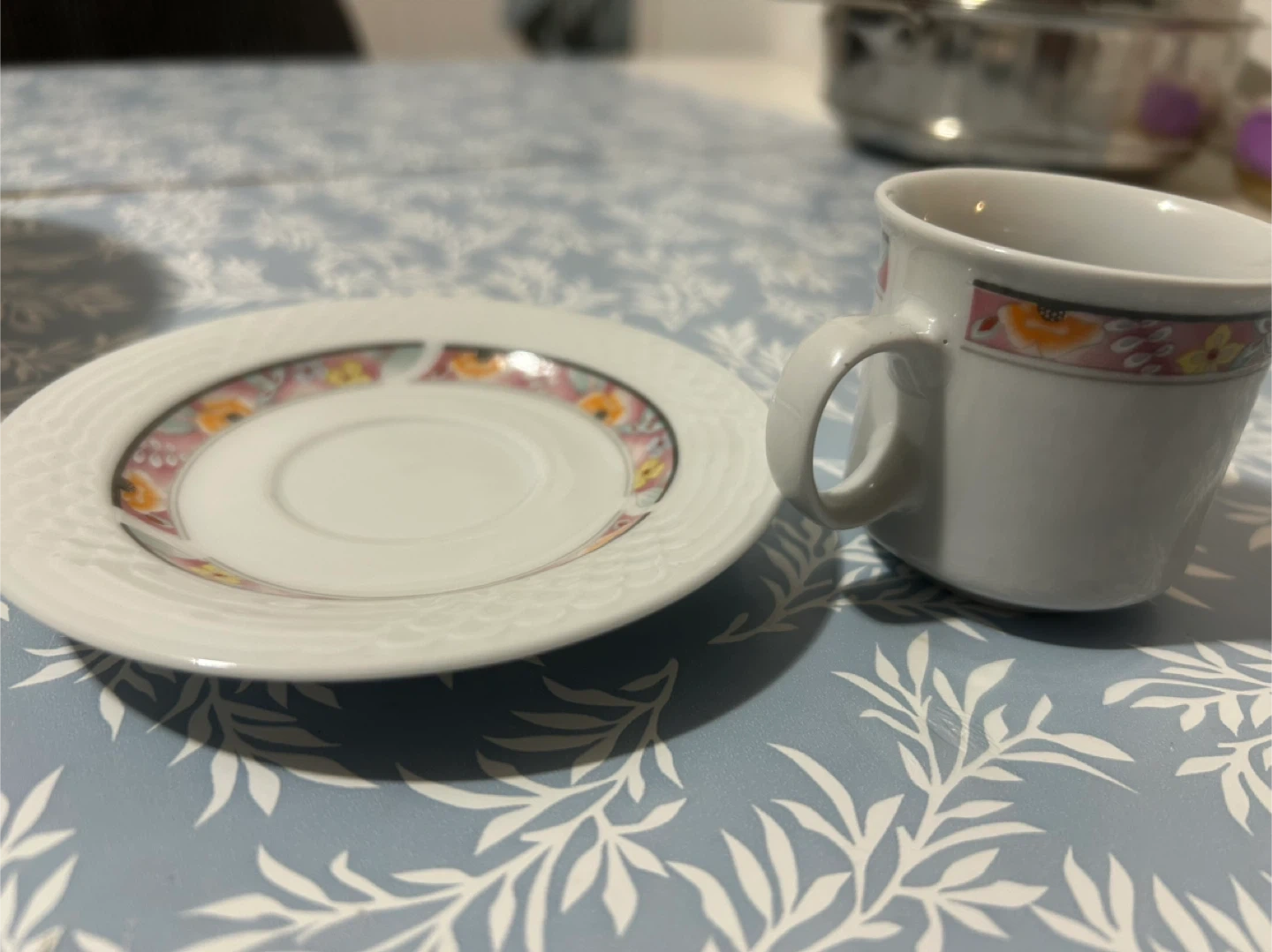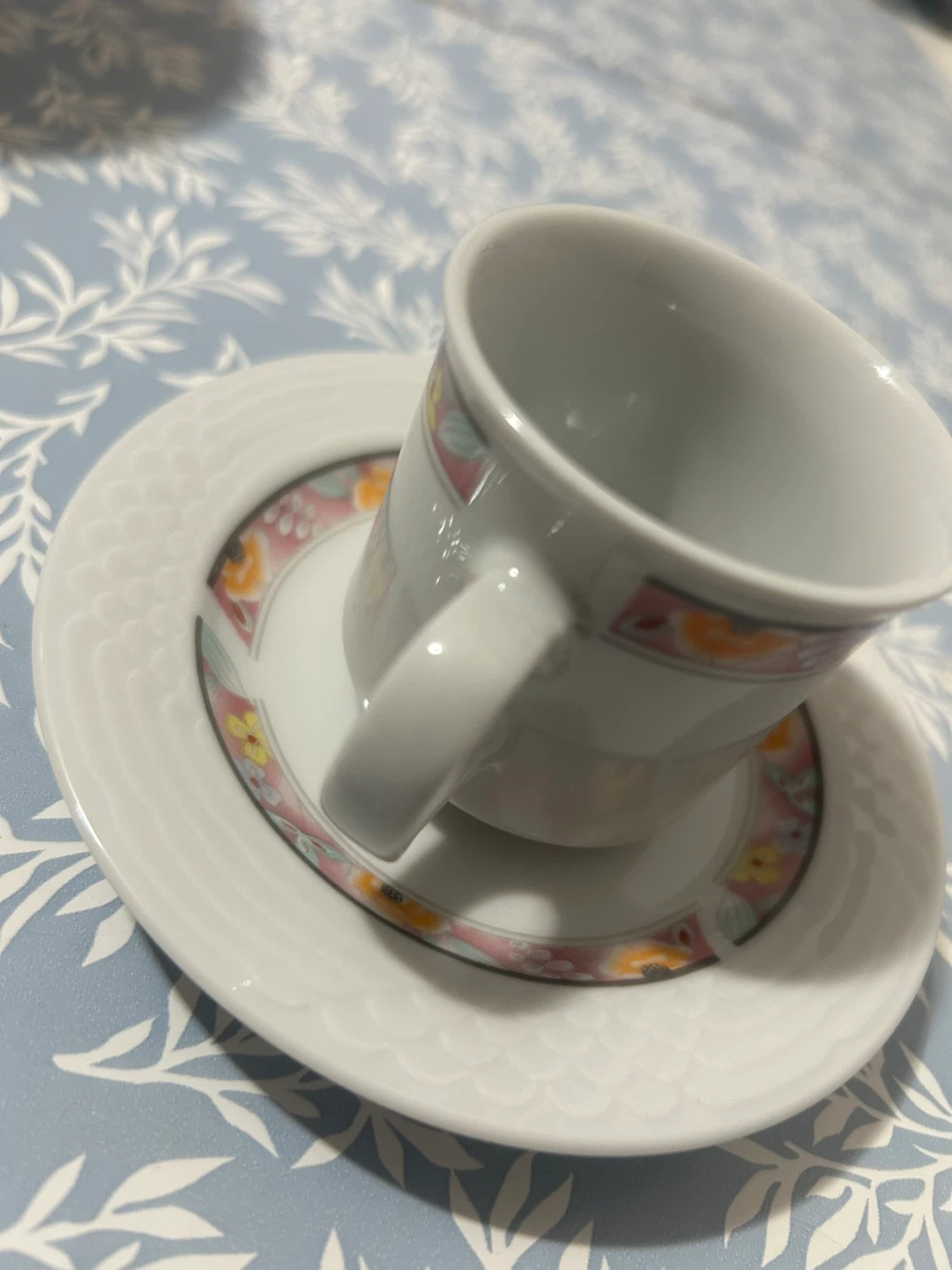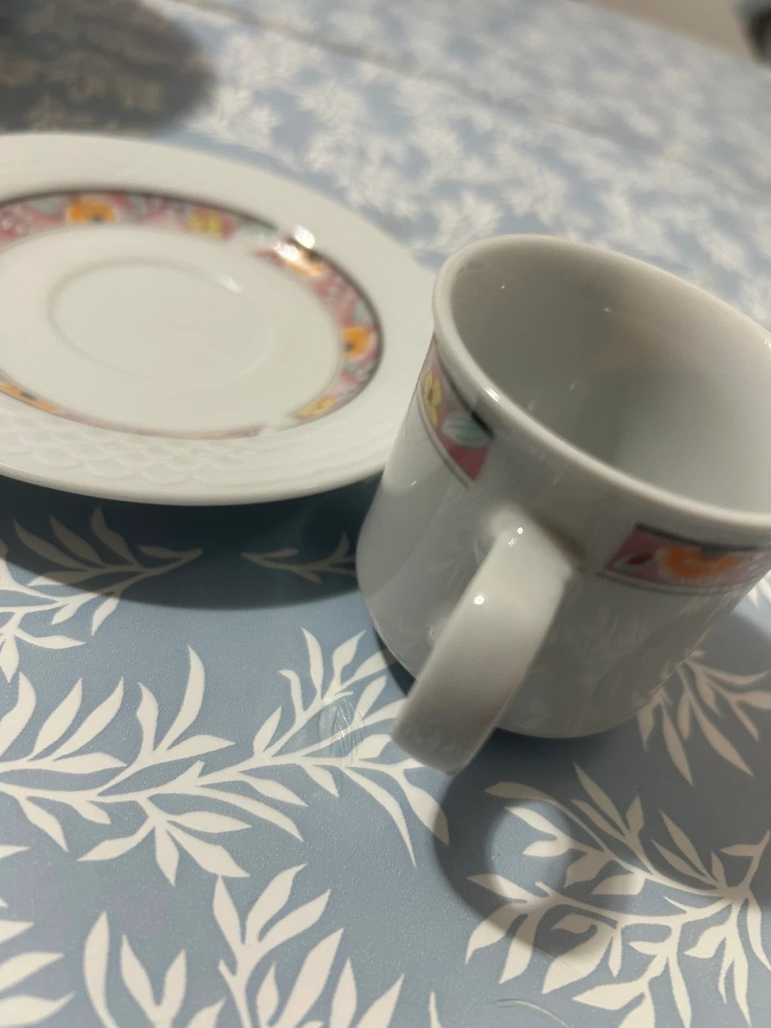 Selling a cute white cup and saucer set. It's perfect for enjoying your morning coffee or tea. The set is in great condition and ready for a new home!