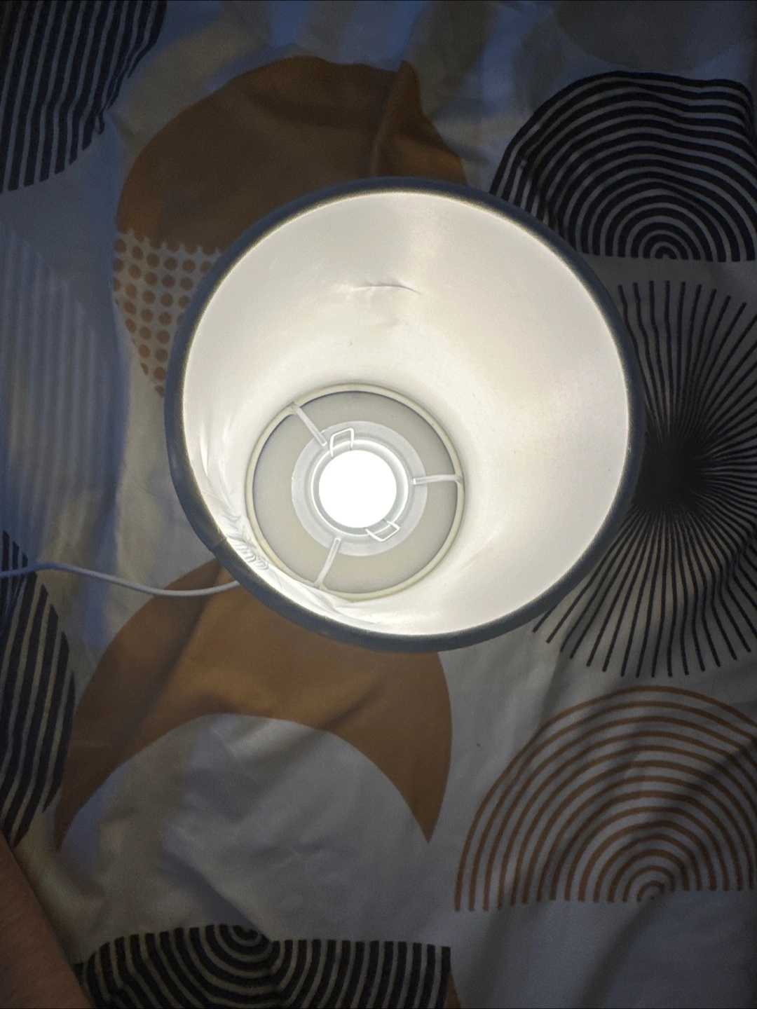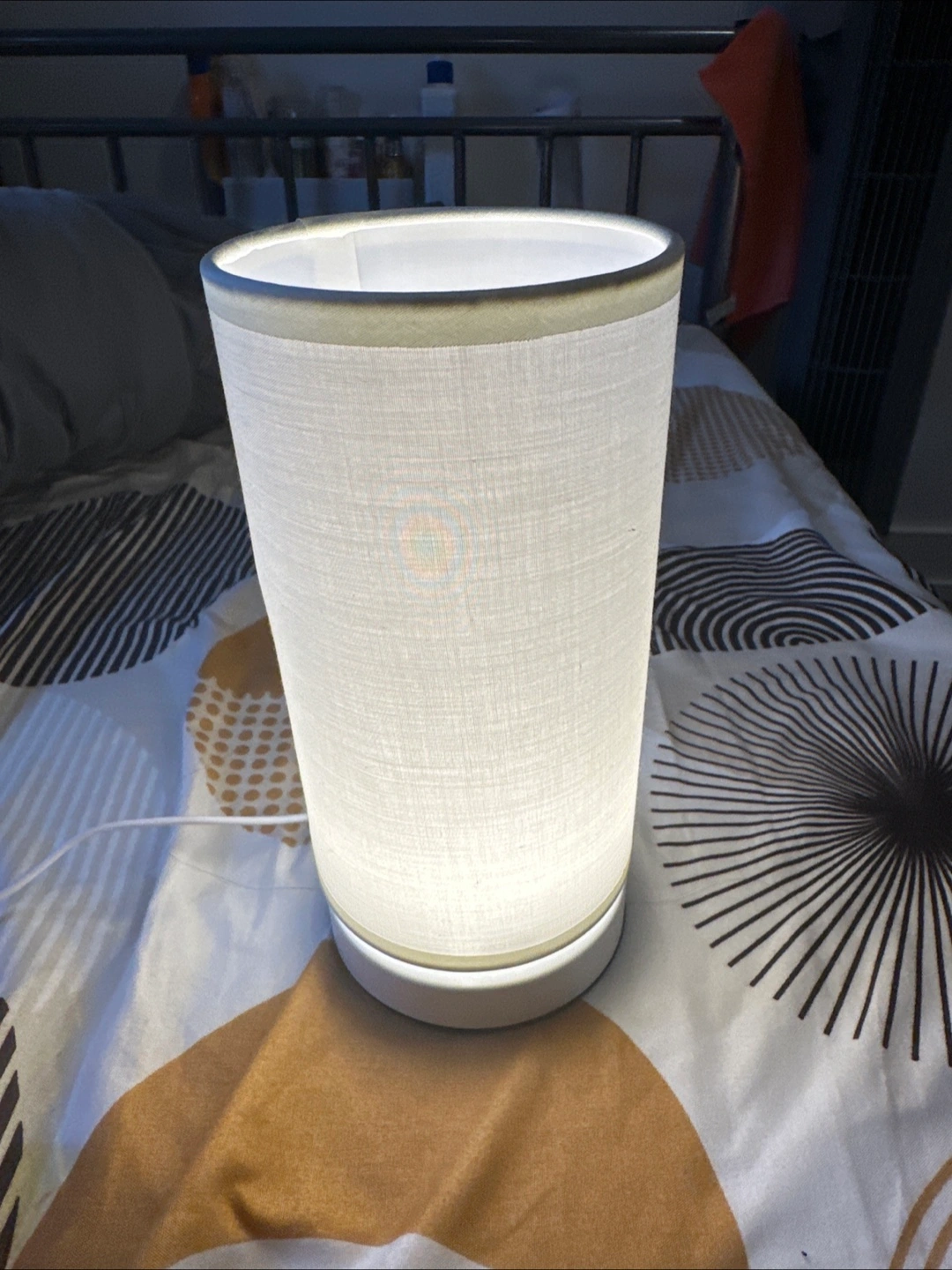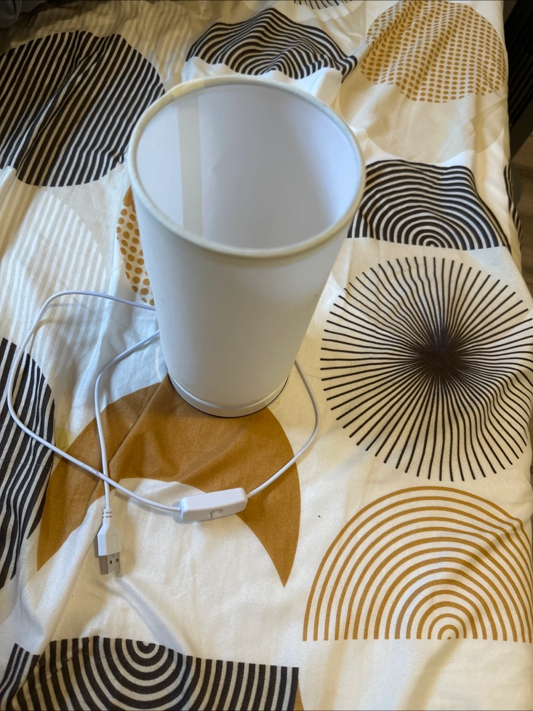 408A cylindrical desk lamp. White in colour. A USB cord with an on/off switch. Perfect to use in the bedroom for reading before bed, creating a relaxed environment.