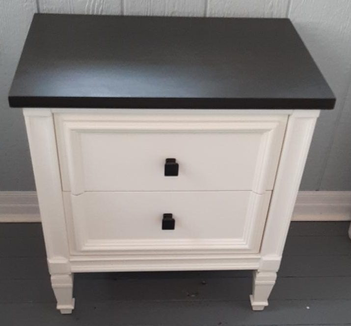 Selling a charming nightstand with a classic design! It features a white frame complemented by a dark grey top. It has two drawers for storage, perfect for keeping your bedside essentials organized and within reach
