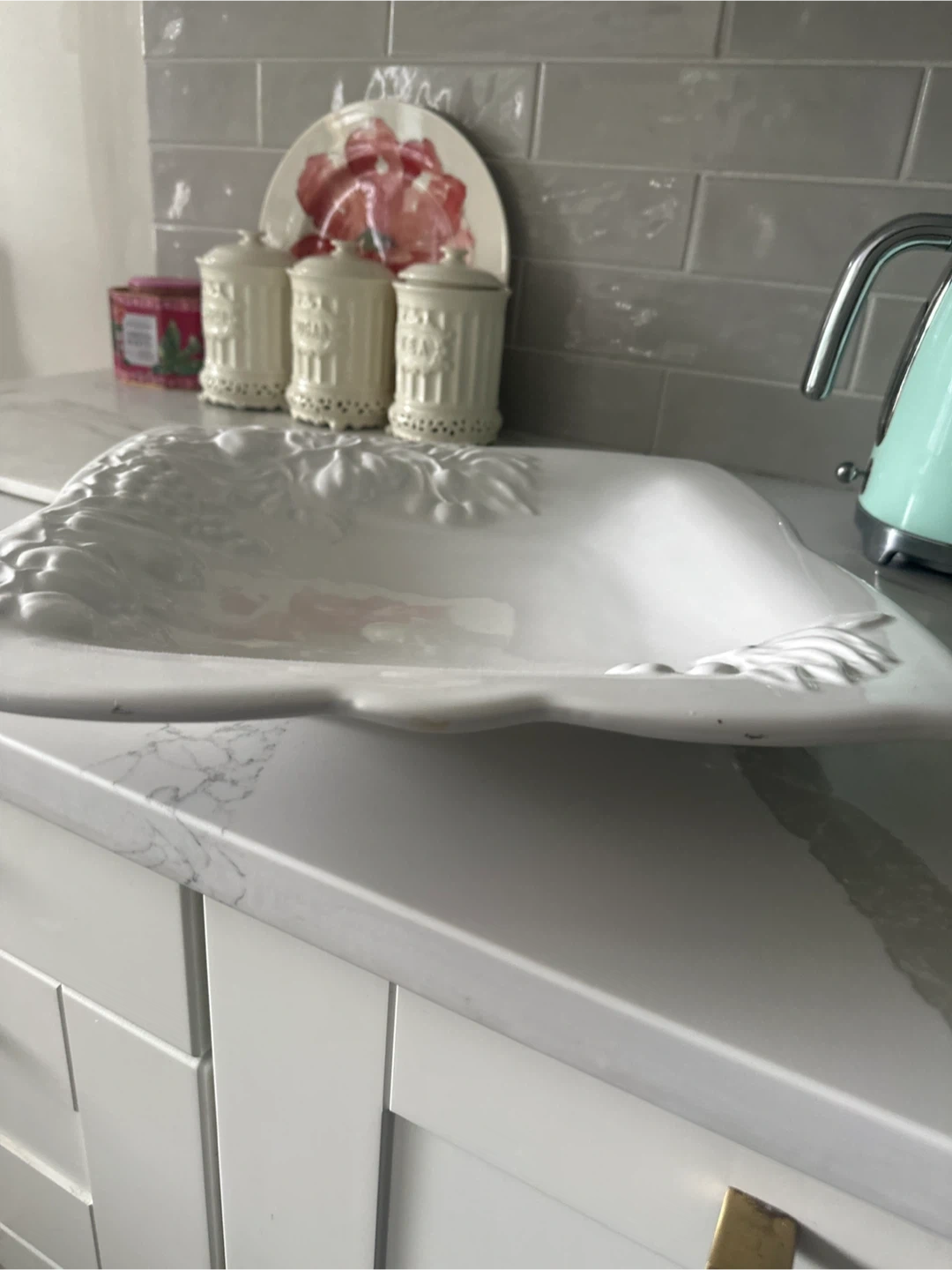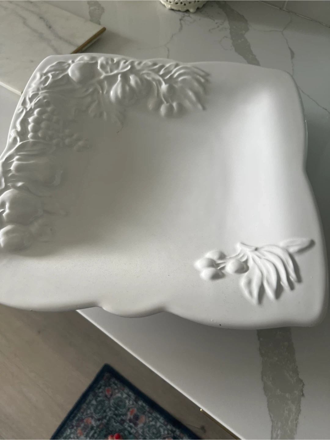 Selling a lovely white decorative serving dish! It features a raised fruit design around the edges, adding a touch of elegance to any table setting. Perfect for serving appetizers, desserts, or as a decorative piece